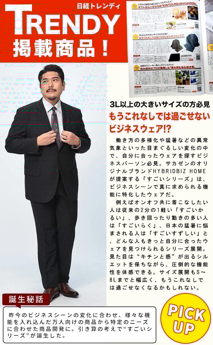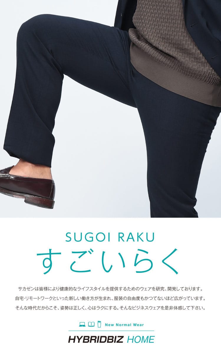 「ハイブリッドビズ (HYBRIDBIZ)」は、スタイリッシュでありながら、ビジネスウェア特有の窮屈さや動きにくさを解消することを目指したシリーズ。その中でも着心地を重視した、従来の商品より2倍伸びる「すごいらく」シリーズです。