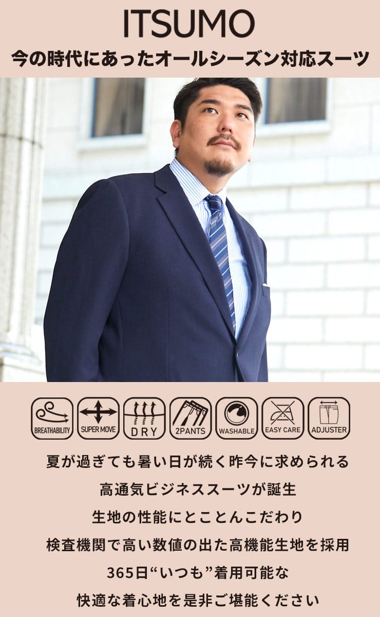 仕様 :ジャケット外側ポケット×3つ / 内側ポケット数×4つ / シングル2つボタン / 背抜き / セッパタイプ / 額縁なし / サイドベンツ / スラックス外側ポケット×4つ / ワンタック / ウォッシャブル / プリーツ加工 / ウエストアジャスター / ツーパンツ / ストレッチ / 通気性/股ずれ防止大シック付き
