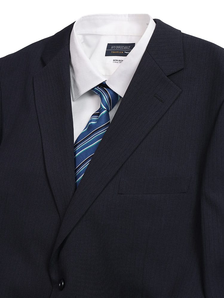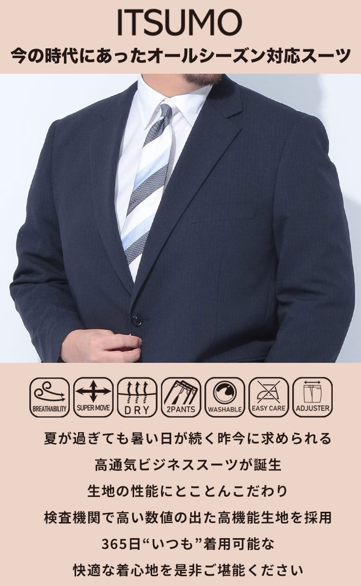 毎日のビジネスを快適に!ZEROWOOLの「ITSUMO」ツーパンツスーツ。忙しいビジネスマンのために生まれた、毎日着たくなる快適なスーツです。ポリエステル100%の生地は、シワになりにくく、イージーケアが可能。ウエストアジャスター付きで、体型の変化にも柔軟に対応。ツーパンツ仕様なので、毎日清潔に着回せます。シングル2つボタンのジャケットは、ビジネスシーンに最適なスマートな印象を与えます。内側と外側に複数のポケットを備え、収納力も抜群。背抜き仕様で、通気性も良く、オールシーズン快適に着用できます。