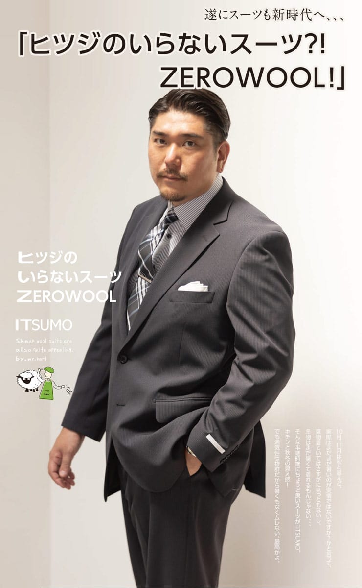 季節で使い分けなくてもいい!本当のオールシーズンスーツ「ZERO WOOL(ゼロウール)スーツ」。最新技術を使用した、羊毛を一切使用しない素材により、暑くも無く寒くもない、ちょうど良い着心地を実現した365日使えるスーツ。