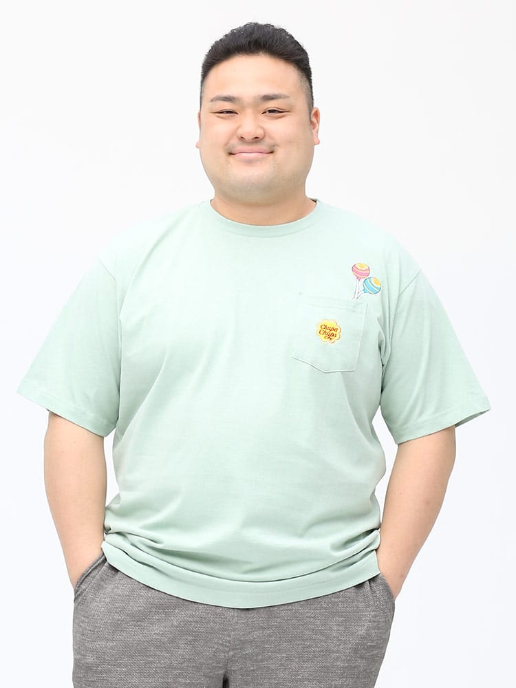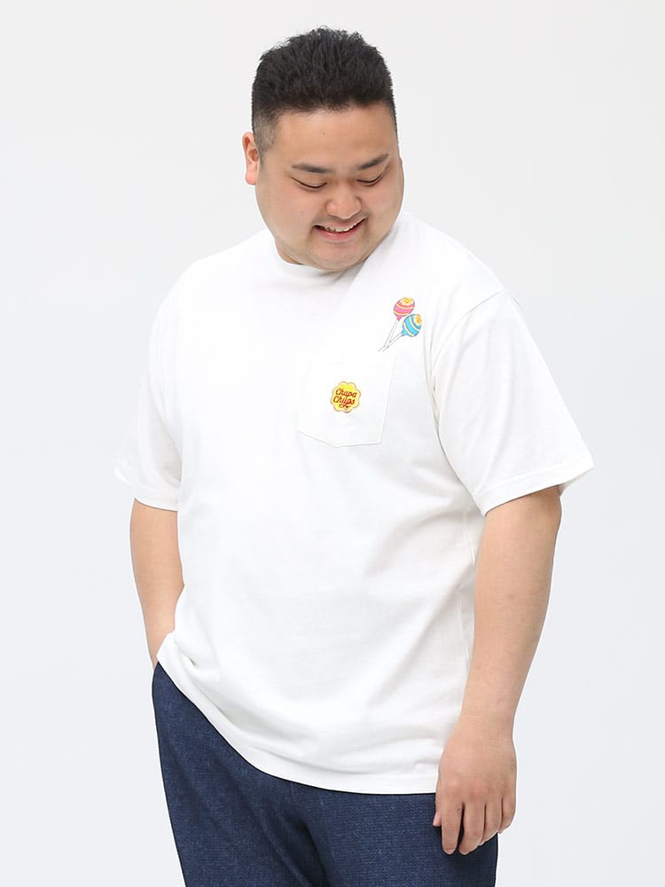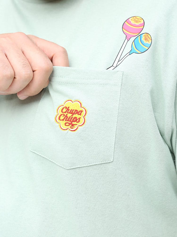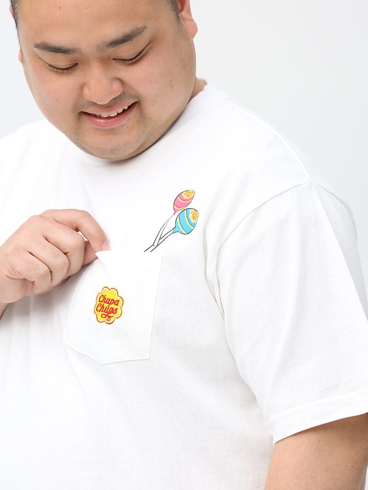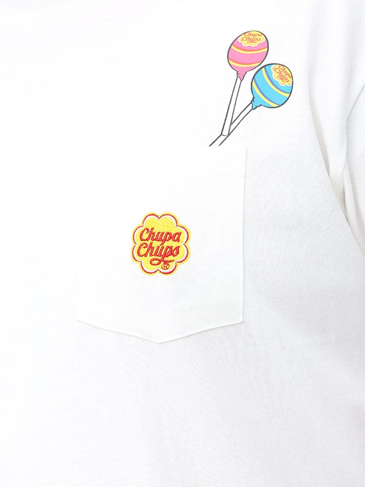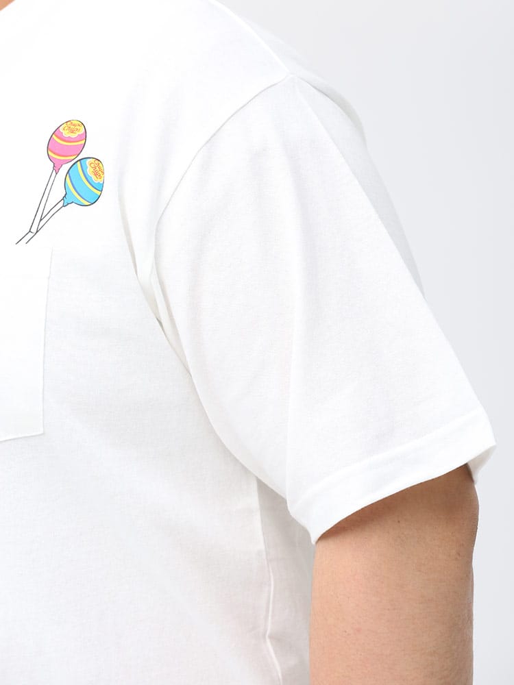 大人気お菓子の「チュッパチャプス」をプリントしたポケット付き クルーネック 半袖 Tシャツです。左胸にポケットと「チュッパチャプス」をプリント。ポップでキャッチーなデザインはコーデの主役になるアイテム。首元はベーシックなクルーネック。肌触りの良いコットン生地を使用し、着心地も抜群な一枚です。