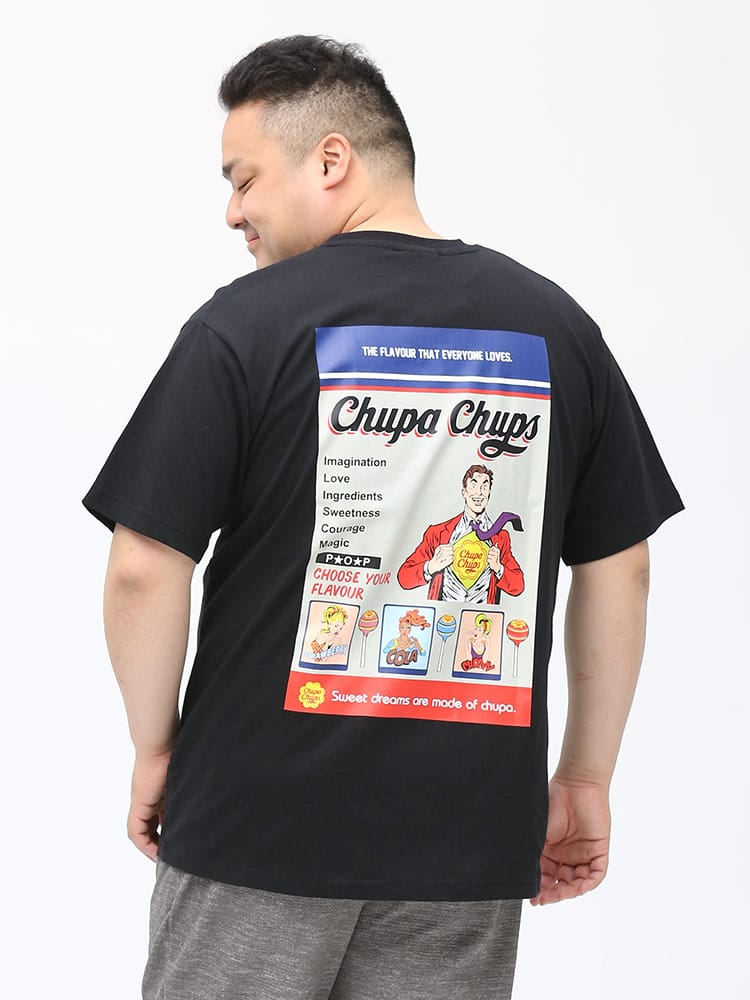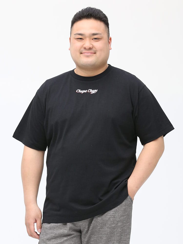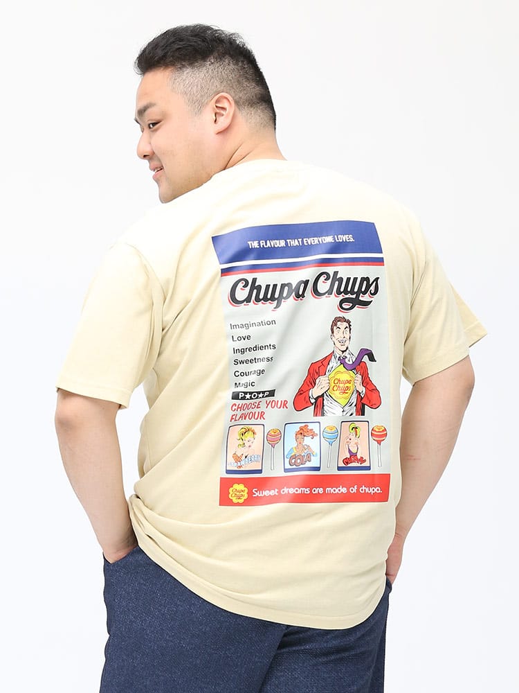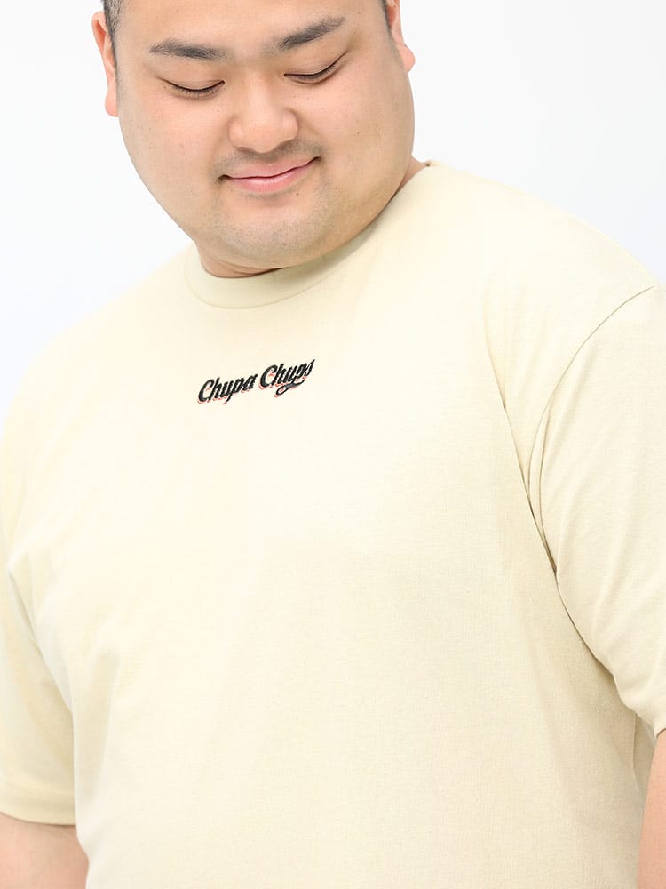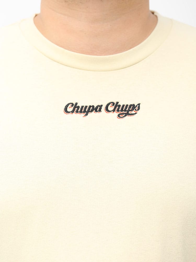 大人気お菓子の「チュッパチャプス」のバックプリントが目を引くクルーネック 半袖 Tシャツ。バックの大きなプリントとフロントのロゴ刺繍がポイント。ポップでキャッチーなデザインはコーデの主役になるアイテム。首元はベーシックなクルーネック。肌触りの良いコットン生地を使用し、着心地も抜群な一枚です。