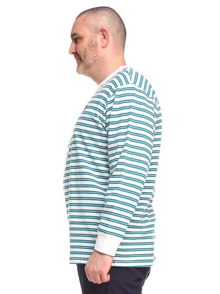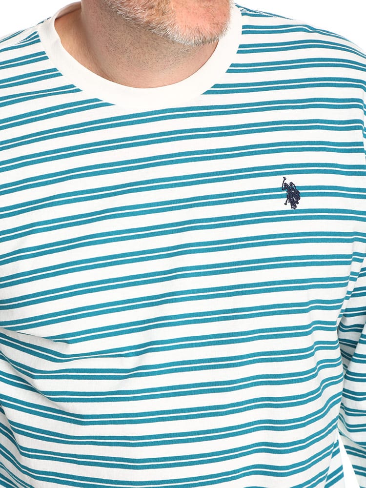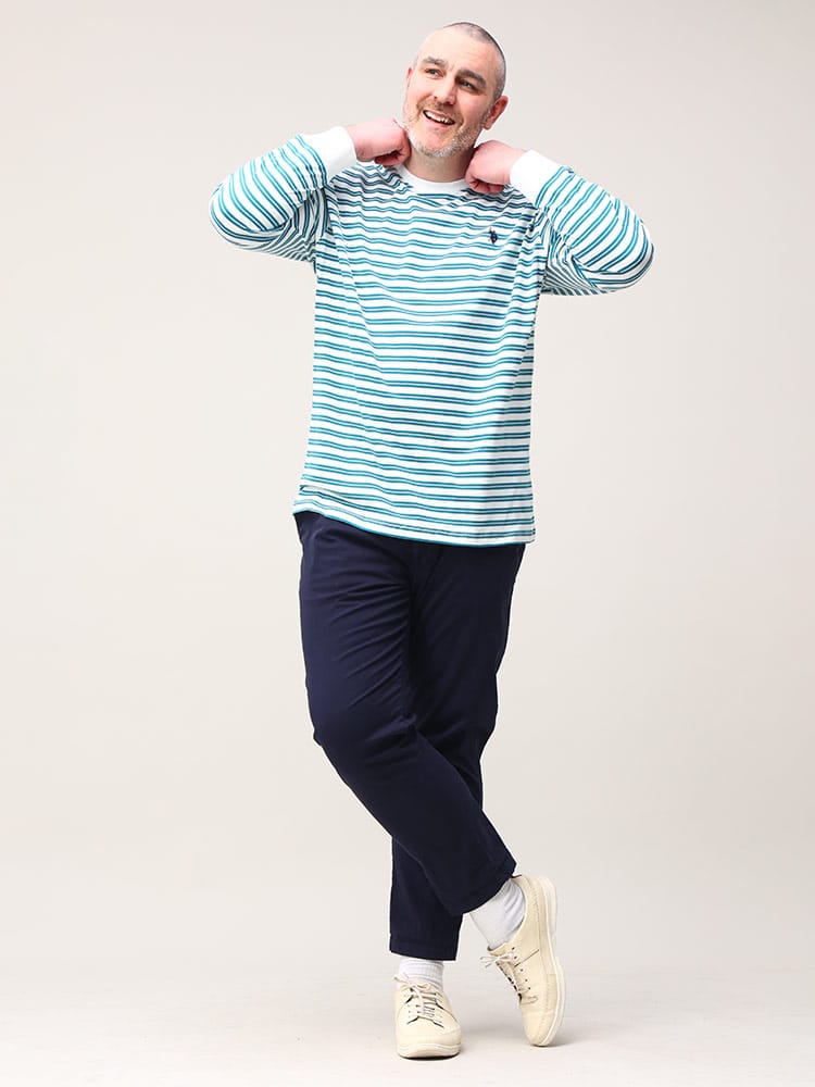 U.S. POLO ASSNの天竺先染ボーダー長袖Tシャツです。シンプルなボーダーロングTシャツは、しっかりとしたコットンの生地感が肌触りの良い一着です。トップスとしてはもちろん、ジャケットやシャツなどのインナーとしてもあわせやすいデザインとなっています。