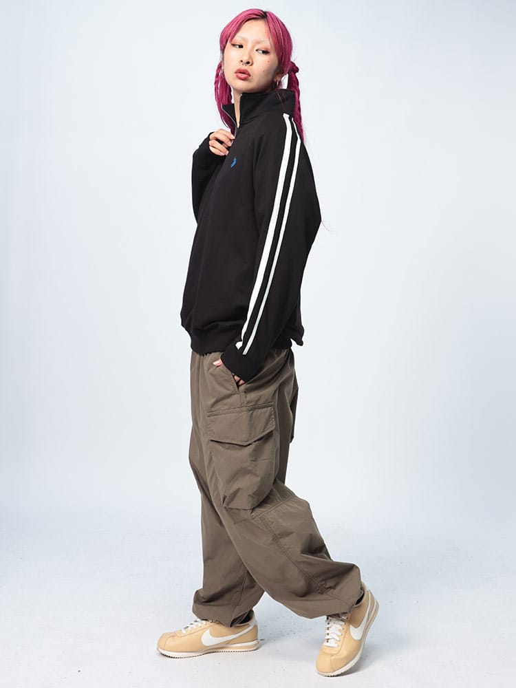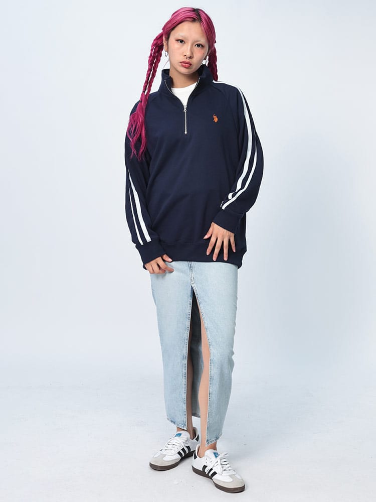 この裏毛ラインデザインハーフジップスウェットは、柔らかな裏毛素材で快適な着心地を提供する一枚です。ハーフジップ仕様により、スタイリッシュで温度調整も簡単です。袖や胸元に施されたラインデザインがアクセントとなり、シンプルながらもスポーティな印象を与えます。カジュアルなスタイルにぴったりで、日常使いからアウトドアシーンまで幅広く活躍します。