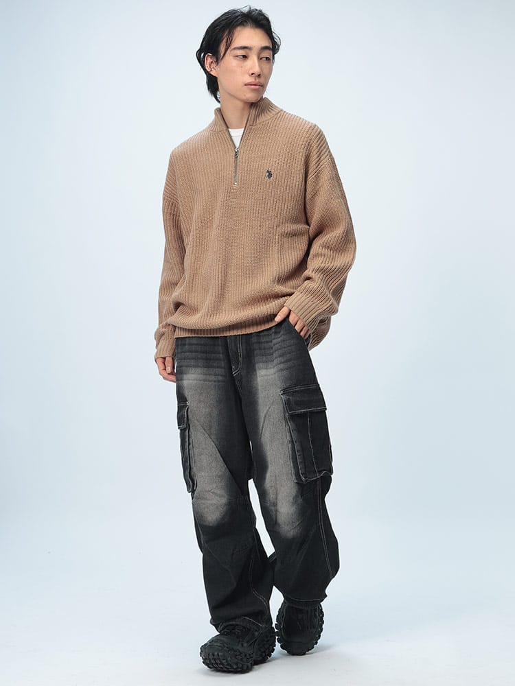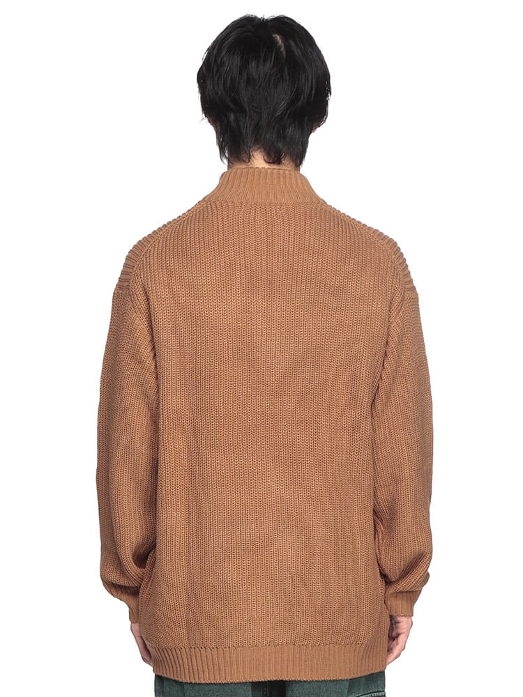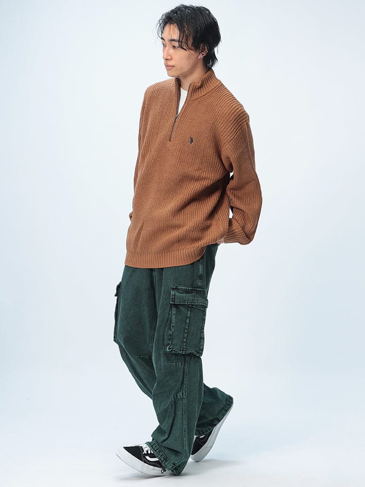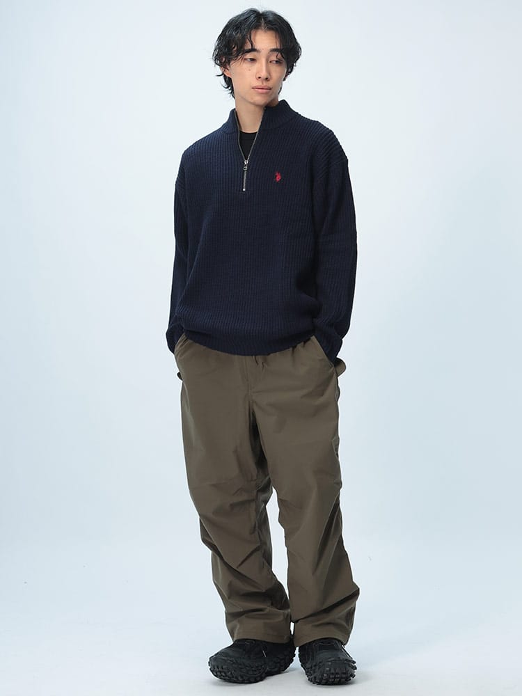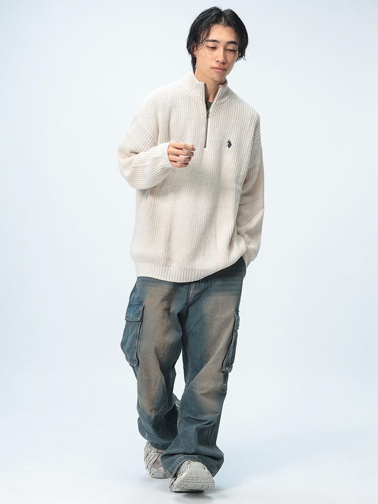 ゆったりとしたビッグシルエットが特徴のハーフジップニット。畔編みで表情豊かな生地感に、胸元のダブルホースの刺繍ロゴがアクセント。柔らかく肌触りの良いアクリル素材を使用しており、リラックスした着心地が魅力です。カジュアルなスタイルはもちろん、レイヤードスタイルにも合わせやすく、幅広いコーディネートを楽しめます。