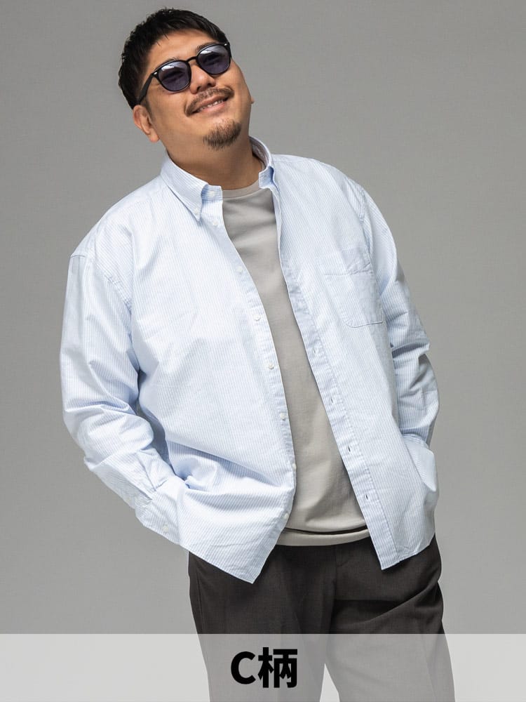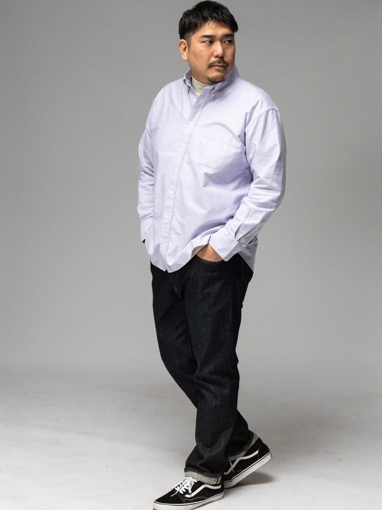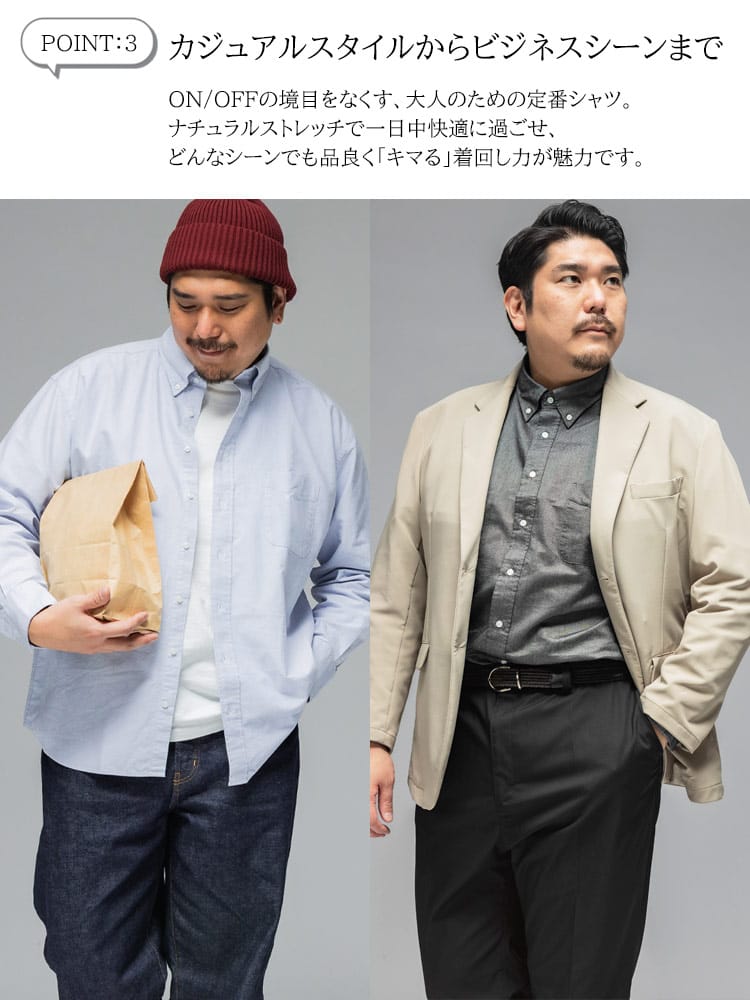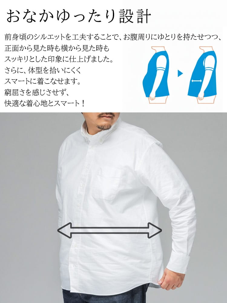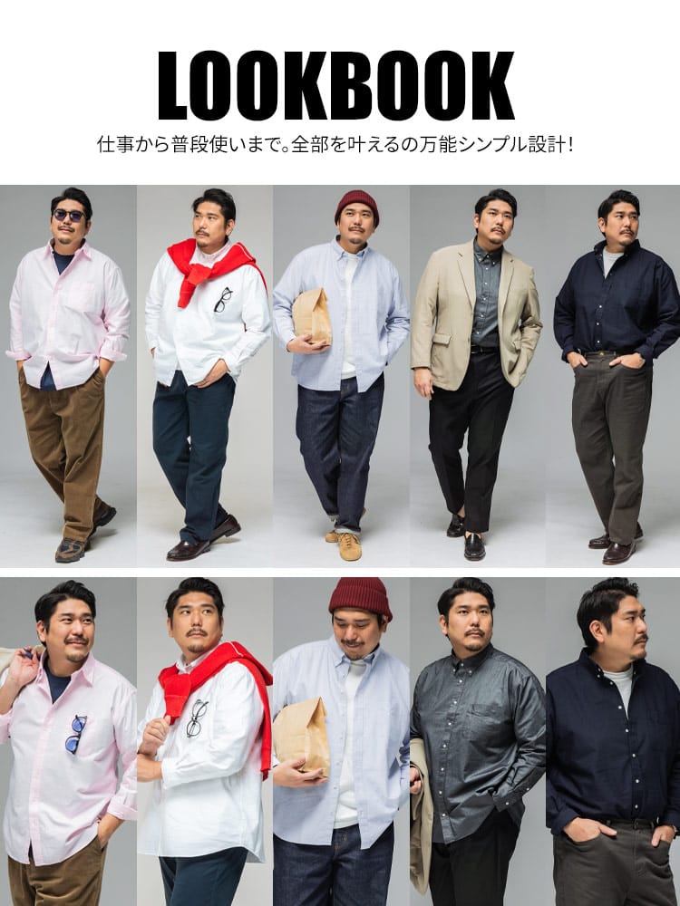 3L~10Lまで対応の安心感 ベーシックなシャツだからこそ、着る人を考え、3Lから10Lまでの幅広いサイズに拘り抜いたサイズ感とシルエット。ぴったりの一着が必ず見つかります。
