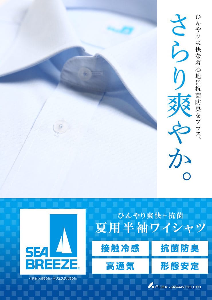 快適な着心地でビジネスシーンをアシストするSEA BREEZE ワイドカラー 半袖 ワイシャツ。抗菌防臭と接触冷感で暑い夏も快適に過ごすことが出来ます。お手入れが楽な形態安定機能付きです。爽やかな色を基調にした春夏のビジネスシーンにぴったりのアイテムです。ゆったり着れるRELAX BODY。