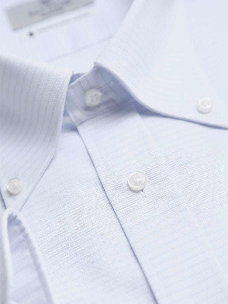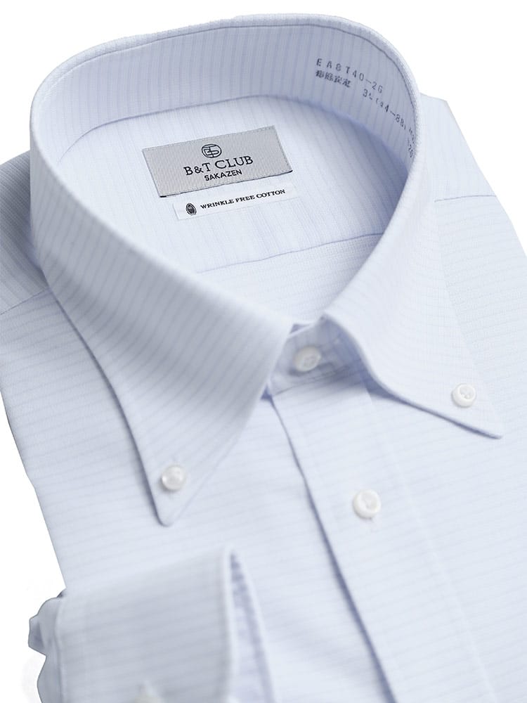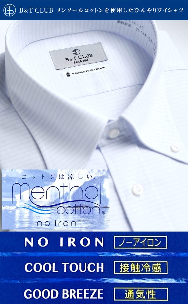 形態安定 接触冷感 綿100% ボタンダウン 長袖 ワイシャツです。「メンソールコットン」を使用しているので、ノーアイロン、接触冷感、通気性の3つの機能性をもった涼感のあるワイシャツとなっています。
