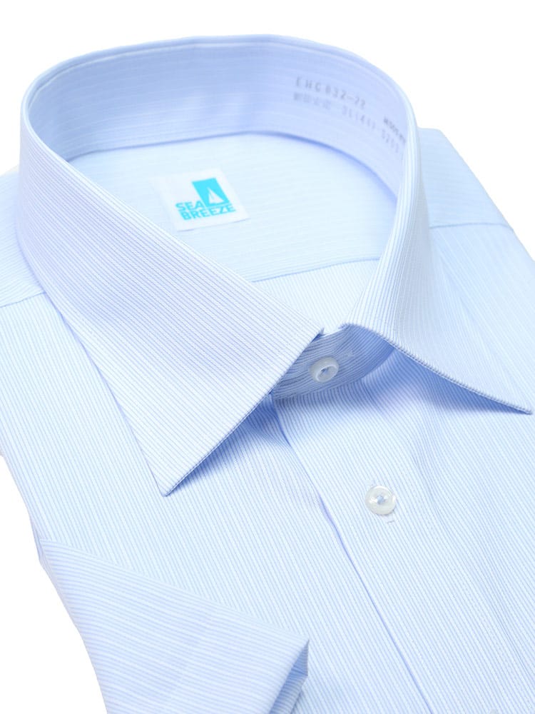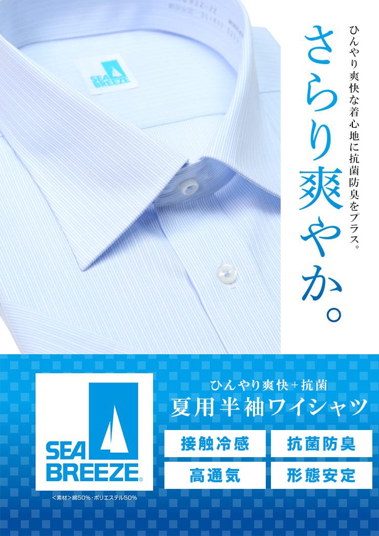 快適な着心地でビジネスシーンをアシストするSEA BREEZEのセミワイドカラー 半袖 ワイシャツ。抗菌防臭と接触冷感で暑い夏も快適に過ごすことが出来ます。お手入れが楽な形態安定機能付きです。高通気構造で通気性も抜群。爽やかな色を基調にした春夏のビジネスシーンにぴったりのアイテムです。キレイなシルエットのSLIMBODY。
