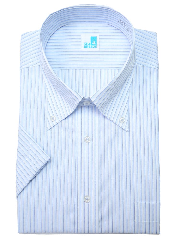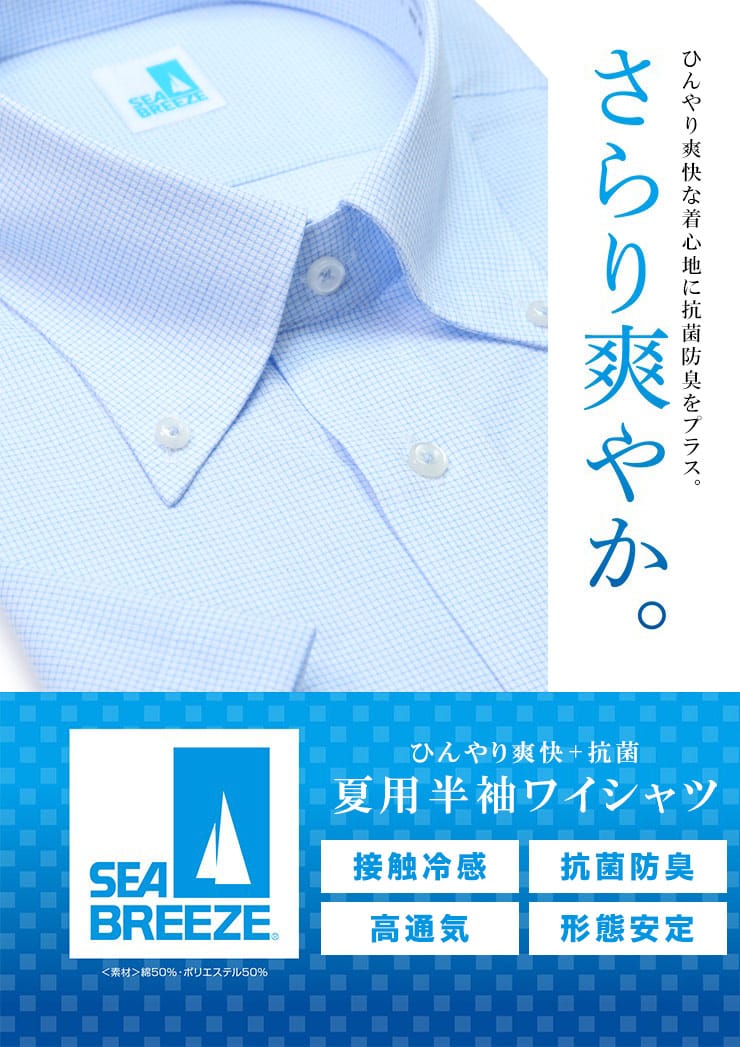 快適な着心地でビジネスシーンをアシストするSEA BREEZEのボタンダウン 半袖 ワイシャツ。抗菌防臭と接触冷感で暑い夏も快適に過ごすことが出来ます。お手入れが楽な形態安定機能付きです。高通気構造で通気性も抜群。爽やかな色を基調にした春夏のビジネスシーンにぴったりのアイテムです。キレイなシルエットのSLIMBODY。