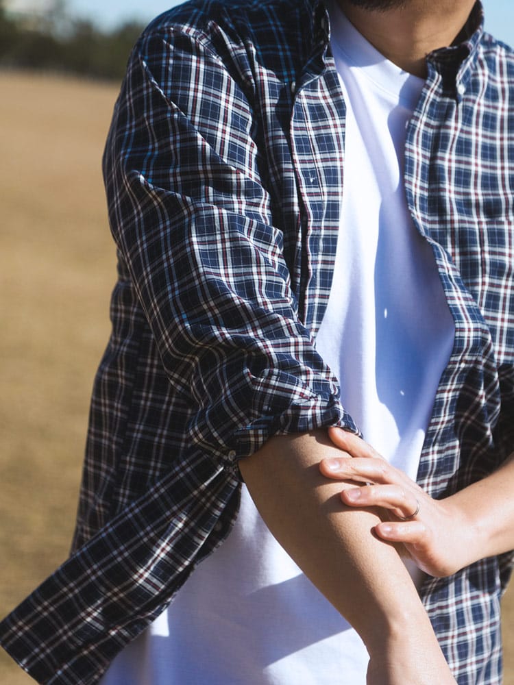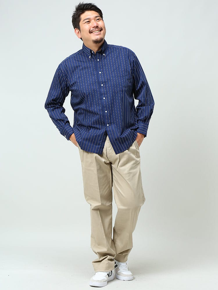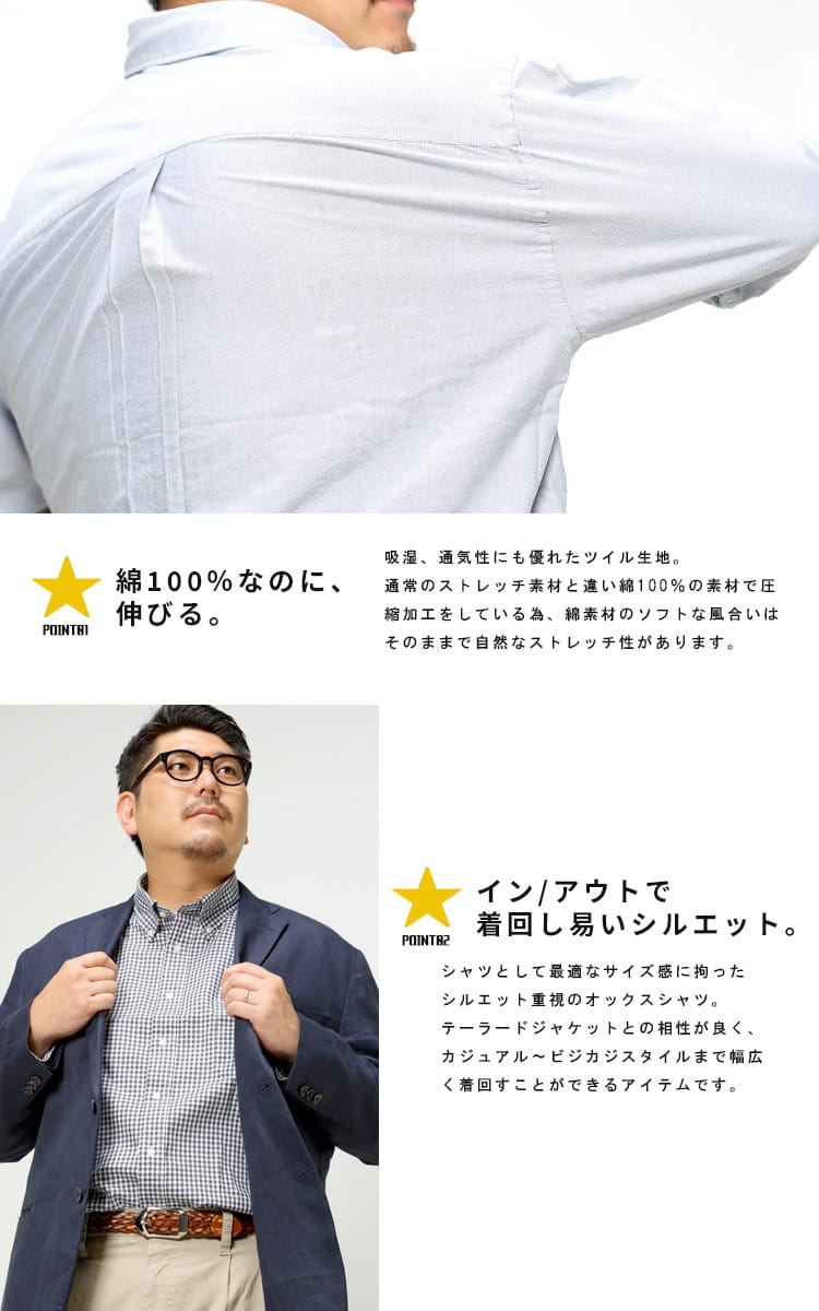通常のストレッチ素材と違い、綿100%の素材で圧縮加工をしている為、綿100%の程よい厚みとソフトな風合いはそのままで、自然なストレッチ性があります。今までのツイルシャツに比べ着心地の良さもUPしています。