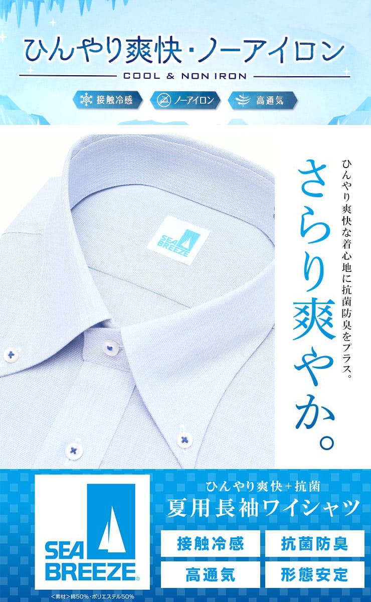 快適な着心地でビジネスシーンをアシストするSEA BREEZEの接触冷感 形態安定 高通気 ボタンダウン 長袖 ワイシャツです。接触冷感により暑い夏も快適に過ごすことが出来ます。お手入れが楽な形態安定機能付きです。高通気構造で通気性も抜群。爽やかな色を基調にした春夏のビジネスシーンにぴったりのアイテムです。ゆったりしたなシルエットのRELAX BODY。