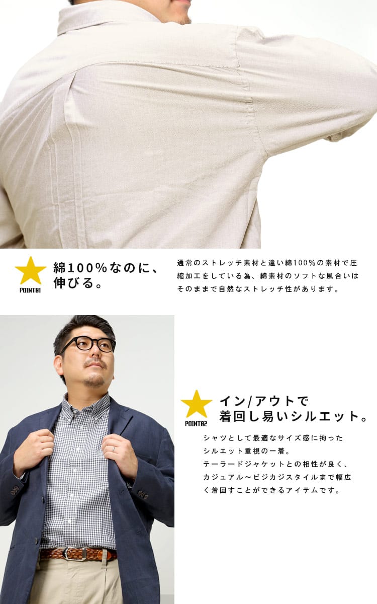 通常のストレッチ素材と違い、綿100%の素材で圧縮加工をしている為、綿100%の程よい厚みとソフトな風合いはそのままで、自然なストレッチ性があります。今までのツイルシャツに比べ着心地の良さもUPしています。