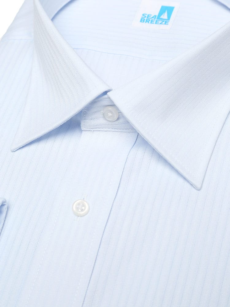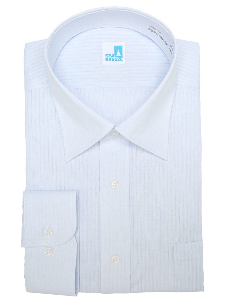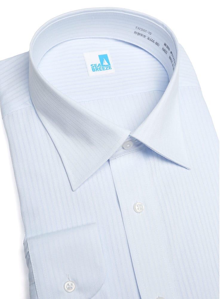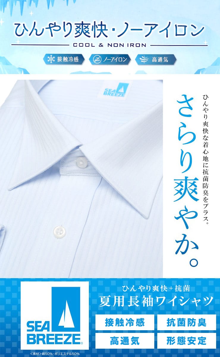 SEA BREEZEの長袖ワイシャツは、接触冷感技術で涼しさを提供し、形態安定性と高通気性が特徴です。セミワイドカラーとリラックスボディデザインで快適な着心地を実現し、ノーアイロンでお手入れも簡単。ビジネスシーンに最適です。