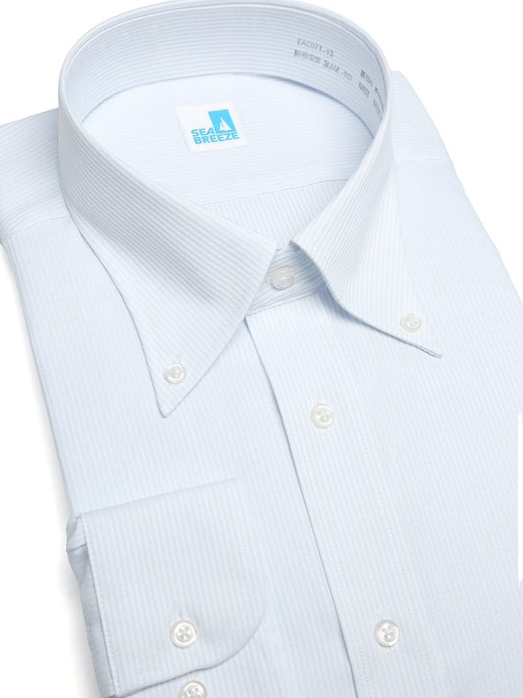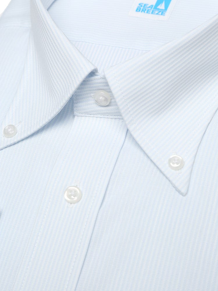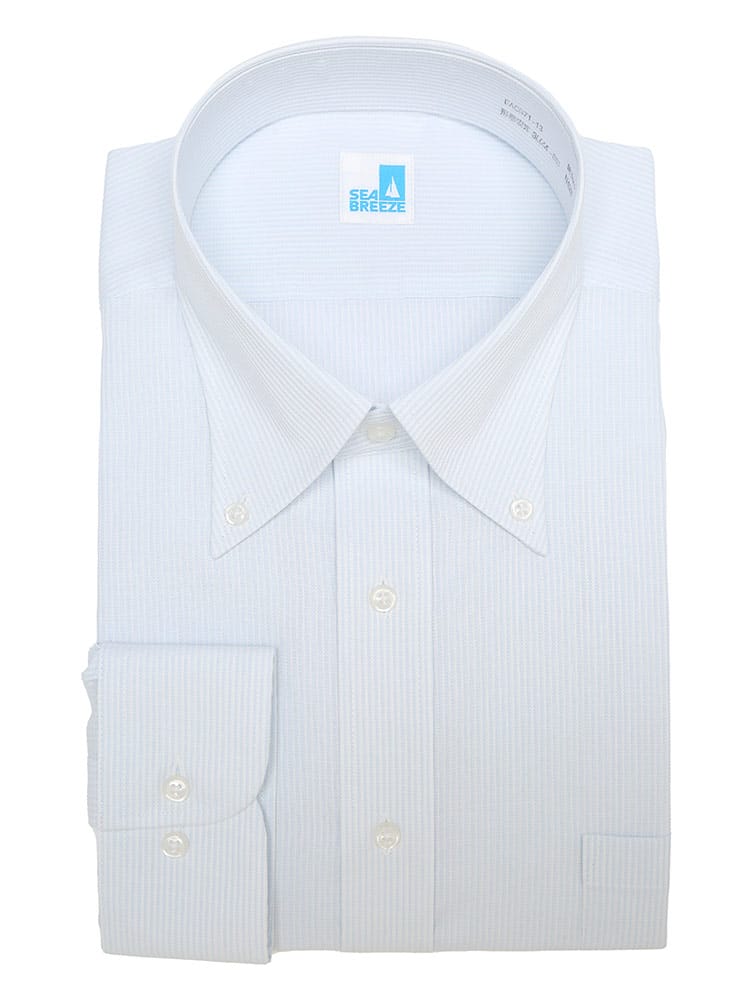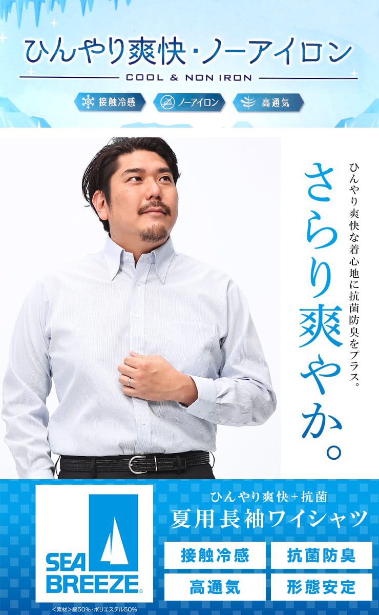 SEA BREEZEの長袖ワイシャツは、接触冷感技術で涼しさを保ち、形態安定と高通気性を備えています。ノーアイロンで手入れが簡単なこのボタンダウンシャツは、スリムボディデザインでスタイリッシュな印象を与え、ビジネスシーンにぴったりです。