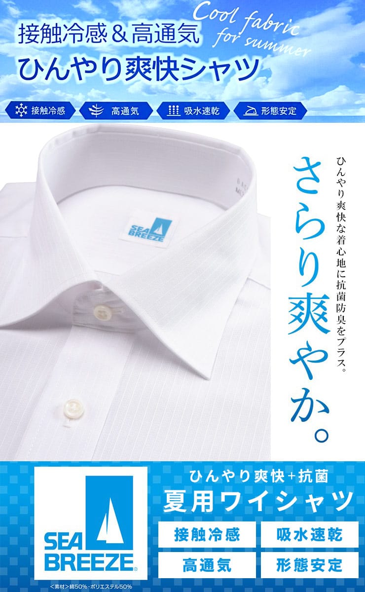 シーブリーズの接触冷感長袖ワイシャツは、触れた瞬間ひんやり、汗をかいても素早く吸収・乾燥する吸水速乾機能付きで、常に爽やかな着心地をキープします。形態安定加工により、シワになりにくくアイロンの手間が省けるため、忙しい毎日にも嬉しい一枚。高通気性素材がムレを防ぎ、快適さを保ちます。ビジネスシーンにも馴染むワイドカラーデザインで、清潔感と涼しさを演出。機能性とデザイン性を兼ね備え、暑くなってくる季節に活躍すること間違いなしです。