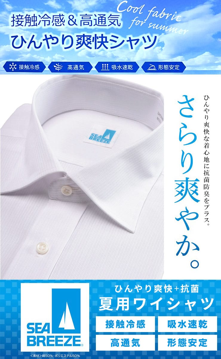 シーブリーズのワイドカラー半袖ワイシャツは、触れた瞬間からひんやり快適な接触冷感素材を採用。汗をかいても素早く吸い取り乾燥させる吸水速乾機能で、ドライな着心地が続きます。形態安定加工により、シワになりにくくお手入れも簡単。さらに高通気性でムレを防ぎ、暑い季節も涼しく過ごせます。すっきりとした印象のワイドカラーは、ビジネスシーンにもカジュアルにも合わせやすく、清潔感と涼しさを演出。機能性とデザイン性を兼ね備えた、暑い季節に活躍する一枚です。