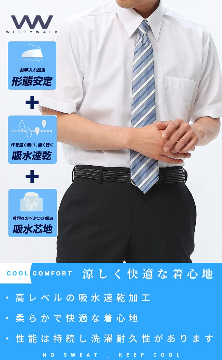 【デキる男の新定番】WITTYWALKの形態安定ワイシャツ。吸水速乾に加え、通気性の良い生地で涼しく快適な着心地を実現。汗をかいてもベタつかず、ドライな肌触りが持続します。綿混素材ならではの優しい風合いも魅力。無駄を省いた白無地レギュラーカラーは、どんなシーンにも対応。外側ポケット付きで利便性も◎。春夏のクールビズに手放せない一枚。清潔感と快適さを両立する、賢いビジネスマンの選択。