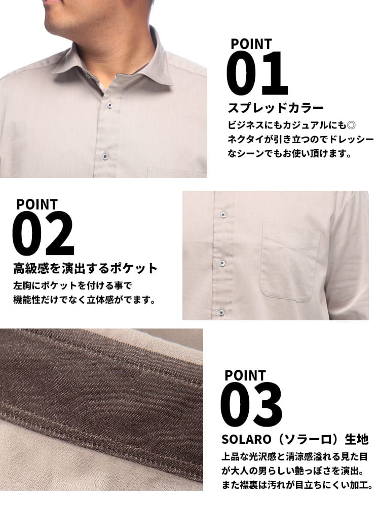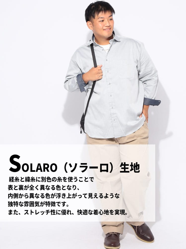 B&T CLUBのSOLAROストレッチカッタウェイシャツは、快適さとスタイルを両立。上品な光沢を放つSOLARO生地は、ストレッチ性も備え、動きやすさ抜群です。首元をすっきりと見せるホリゾンタルカラーと、美しいカッタウェイデザインが洗練された印象を与え、ビジネスシーンからカジュアルまで幅広く活躍します。