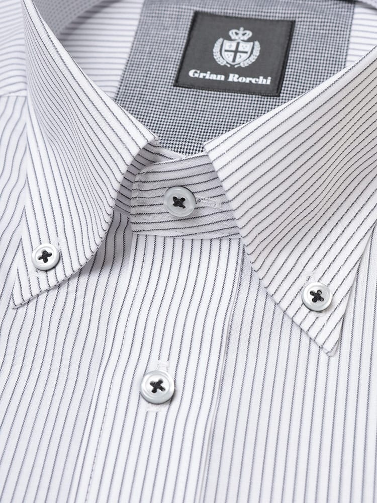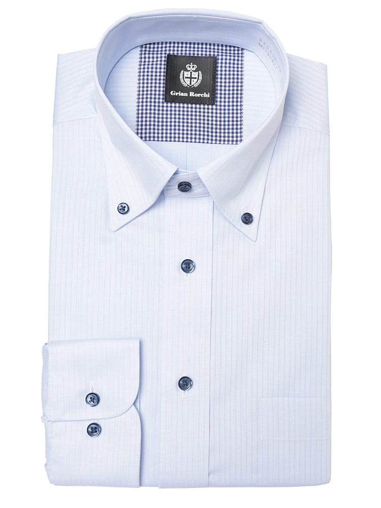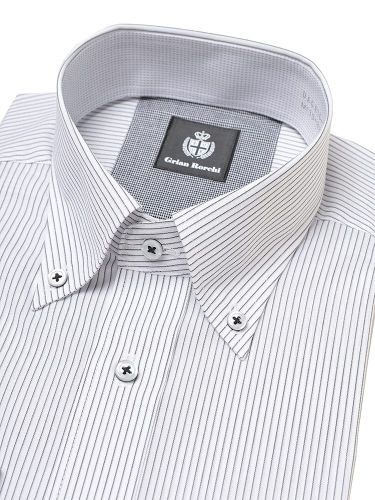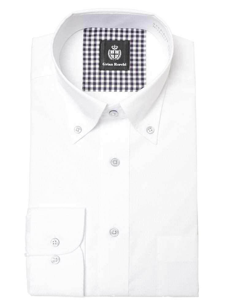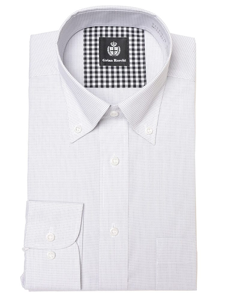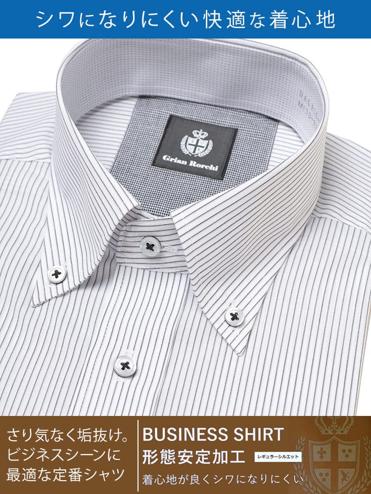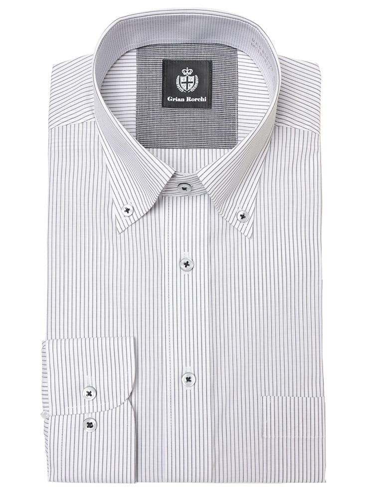 ビジネスシーンに最適な、Grian Rorchiの長袖ワイシャツ。定番のボタンダウンカラーは、ネクタイを締めても外しても様になる万能デザインです。形態安定加工が施されており、シワになりにくいため、お手入れの手間を大幅に軽減します。清潔感のあるレギュラーシルエットは、どんな体型にも馴染み、快適な着心地を提供。信頼感と品格を兼ね備え、忙しい毎日をサポートする頼もしい一着です。