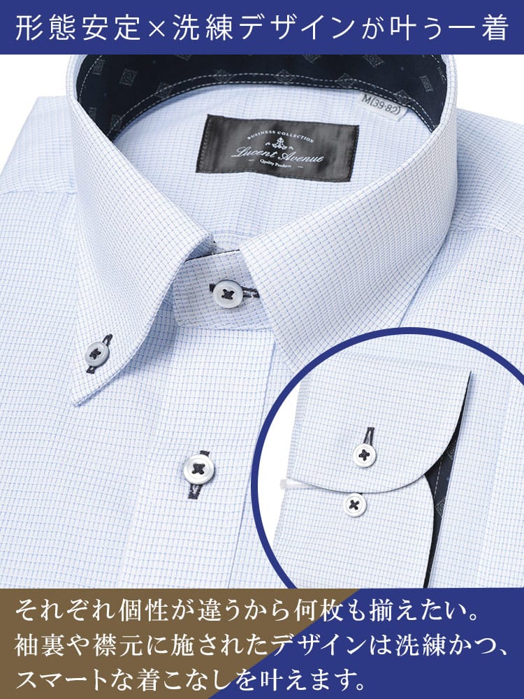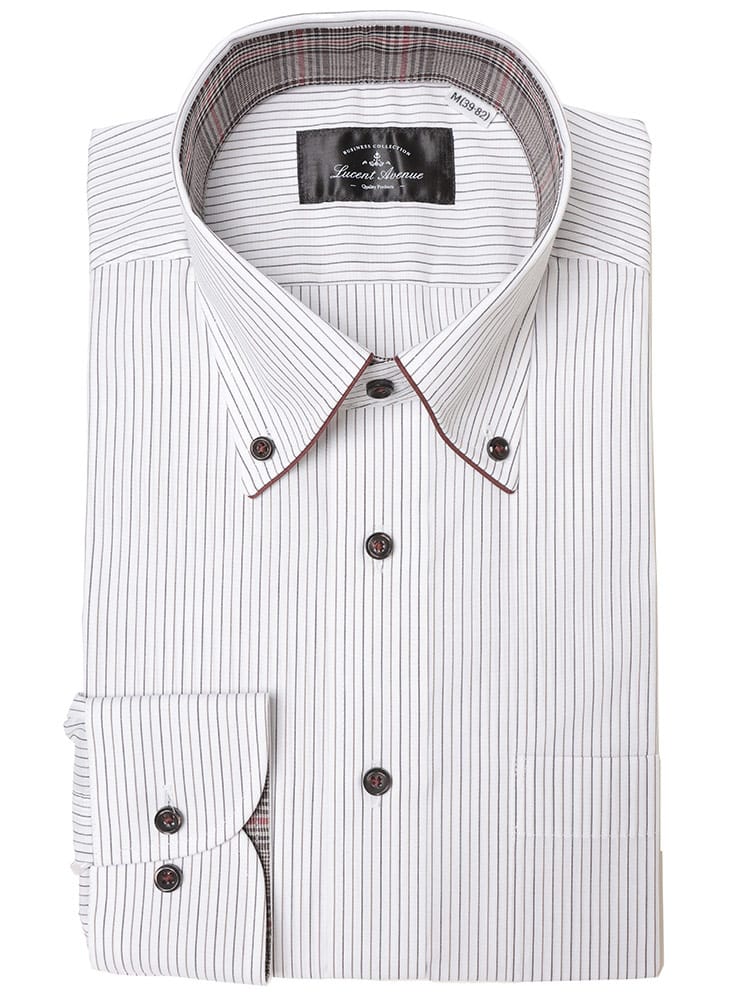 モダンな魅力あふれる、LucentAvenueの長袖ワイシャツ。ホリゾンタルカラーとボタンダウンのバリエーションが、個性を引き立てます。形態安定加工でシワになりにくく、スリムなシルエットがスマートな着こなしを演出。袖裏のデザインもさりげないアクセントです。洗練されたスタイルで、ビジネスシーンを軽やかに彩ります。