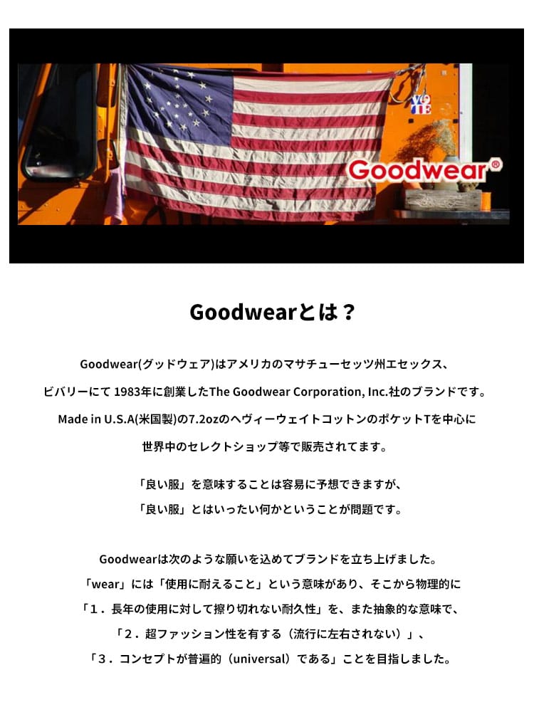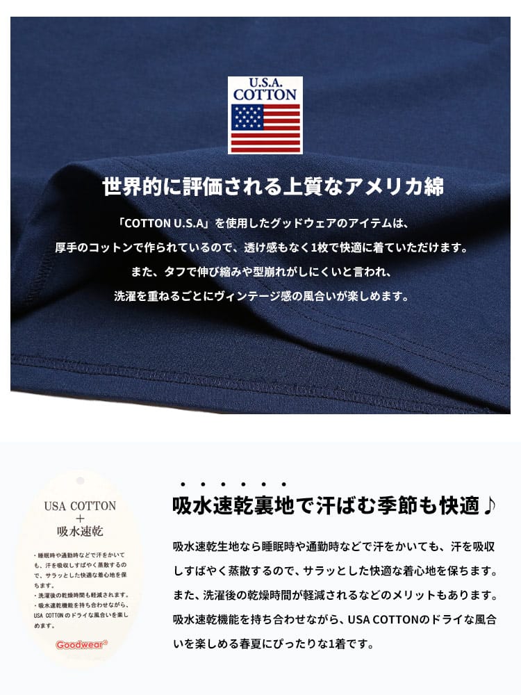 USAコットンに吸水速乾機能が付いたGoodwearのポケット クルーネック BIG 7分袖 Tシャツ。無地のシンプルなデザインに左胸のポケットがポイント。ビッグシルエットでトレンドな着こなしが出来るアイテム。首元はベーシックなクルーネック。吸水速乾機能を持ち合わせながら、USA COTTONのドライな風合いをお楽しみいただけます。