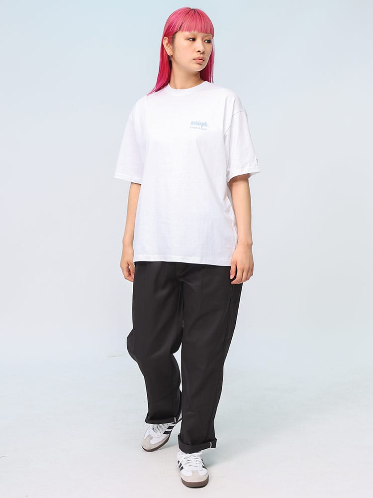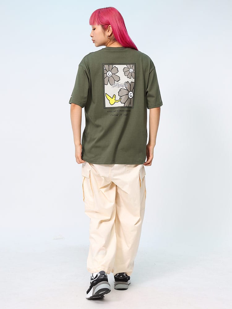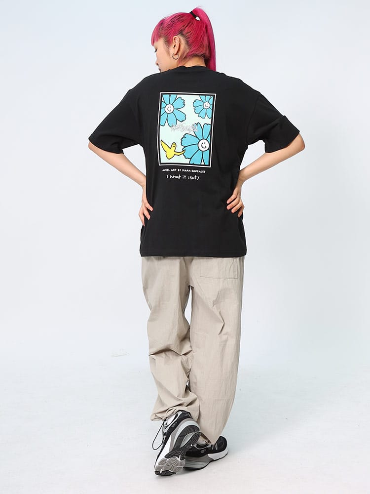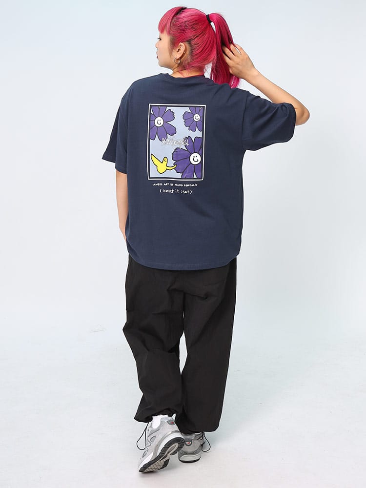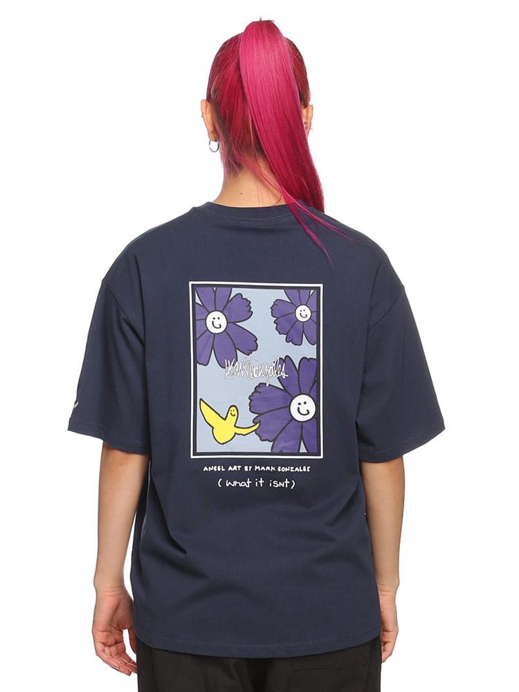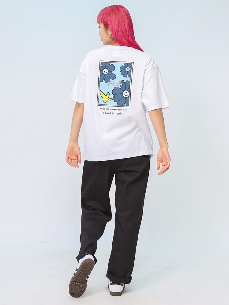 Mark GonzalesのフラワーバックプリントTシャツは、男女兼用でスタイリッシュな半袖クルーネックデザインです。背面には鮮やかなフラワーのグラフィックがプリントされており、フロントには控えめなロゴが入っています。快適な着心地を提供するソフトな素材を使用し、カジュアルながらもアーティスティックな印象を与えるアイテムです。