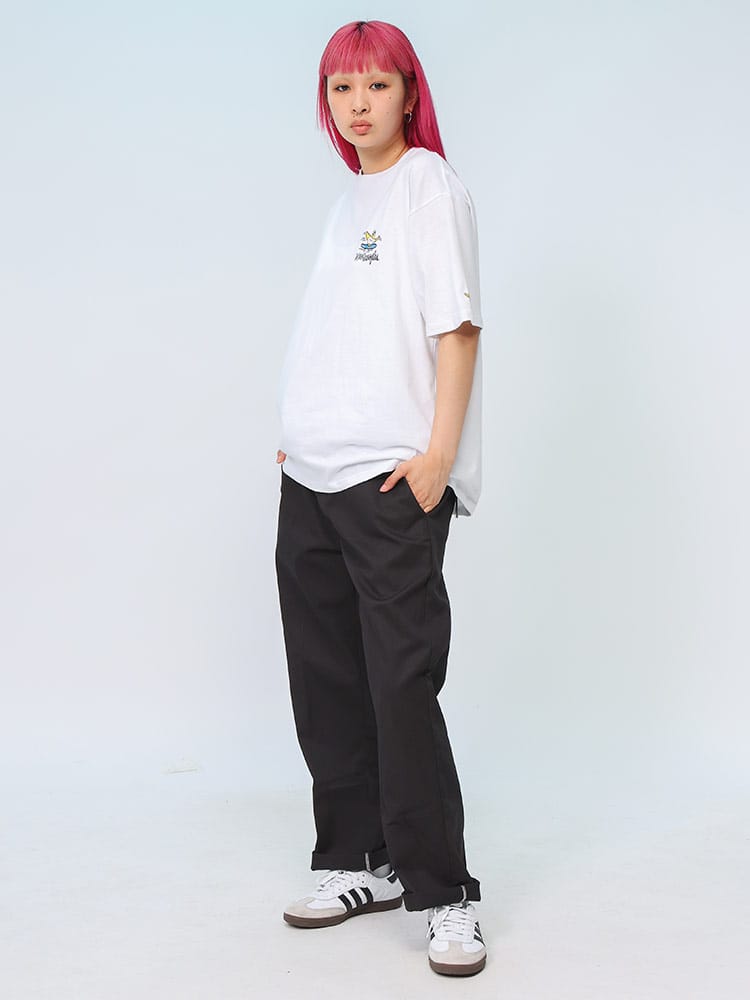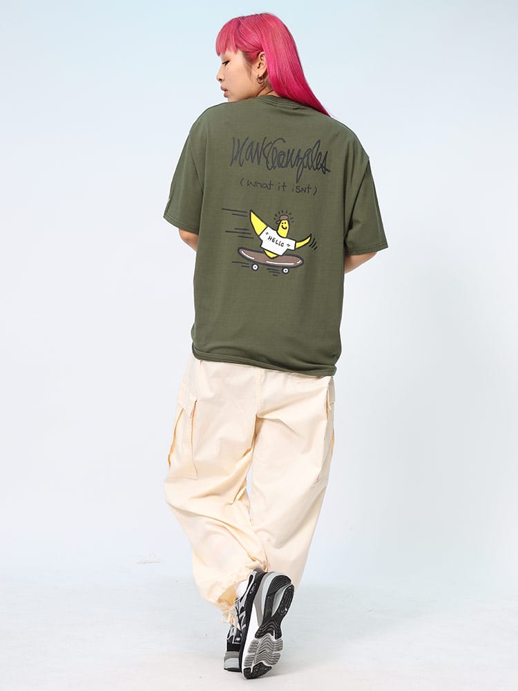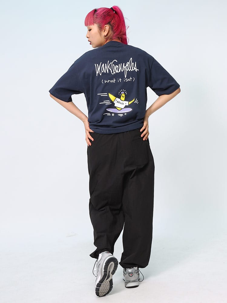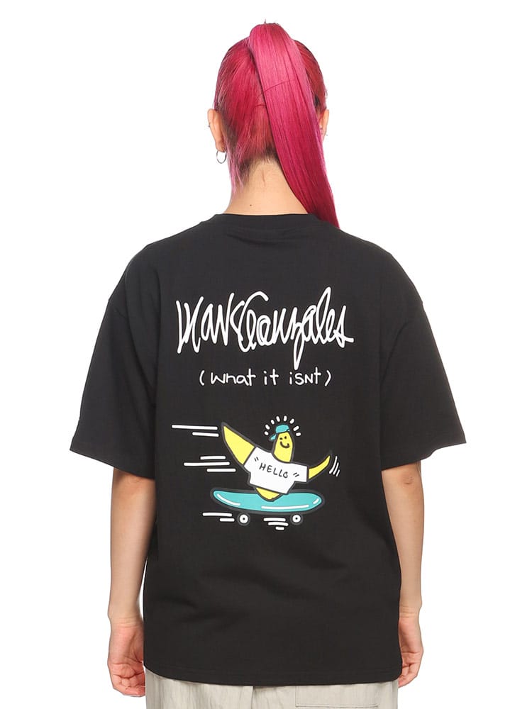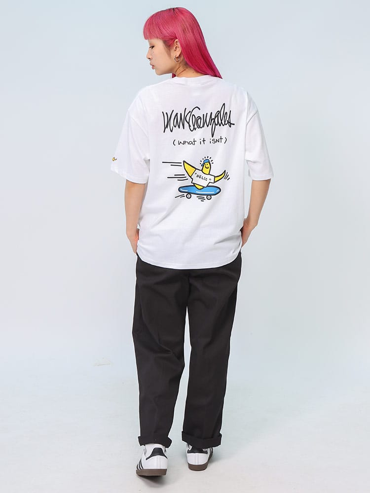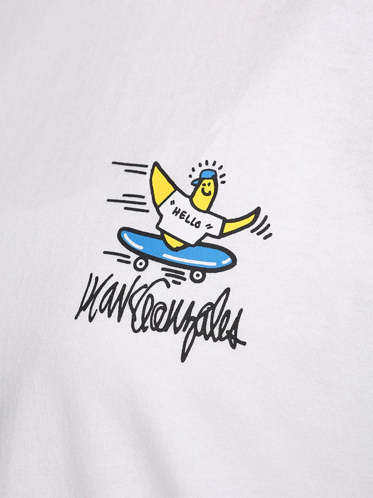 スケートボード界の象徴的人物マーク・ゴンザレスのデザインが特徴的なユニセックスアイテムです。クラシックなクルーネックと半袖の形状に、背面にはスケートボードをテーマにした「スケボーバックプリント」が施されています。このプリントは動きのあるスケートシーンをアーティスティックに表現しており、都会的でクリエイティブな雰囲気を醸し出しています。日常のカジュアルスタイルにダイナミックなアクセントを加える一枚です。