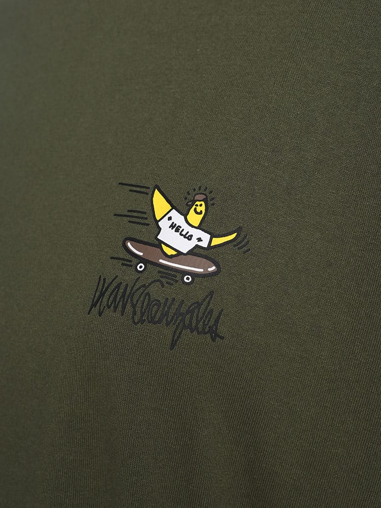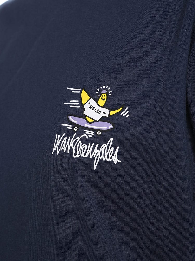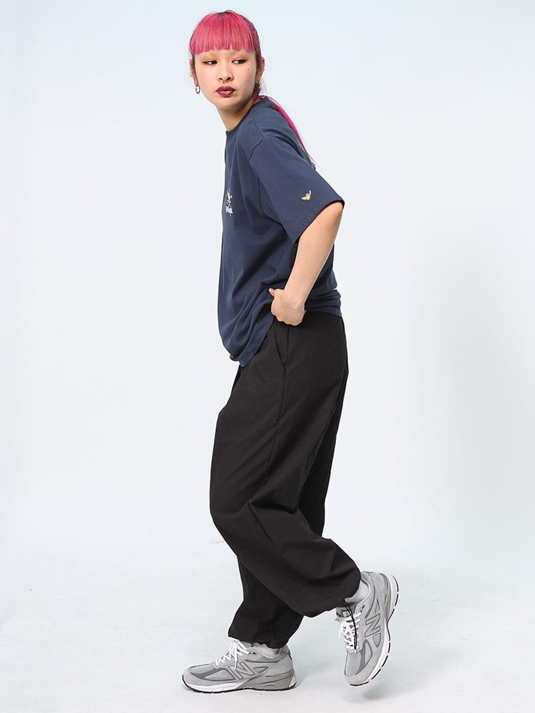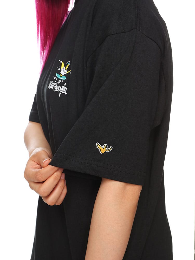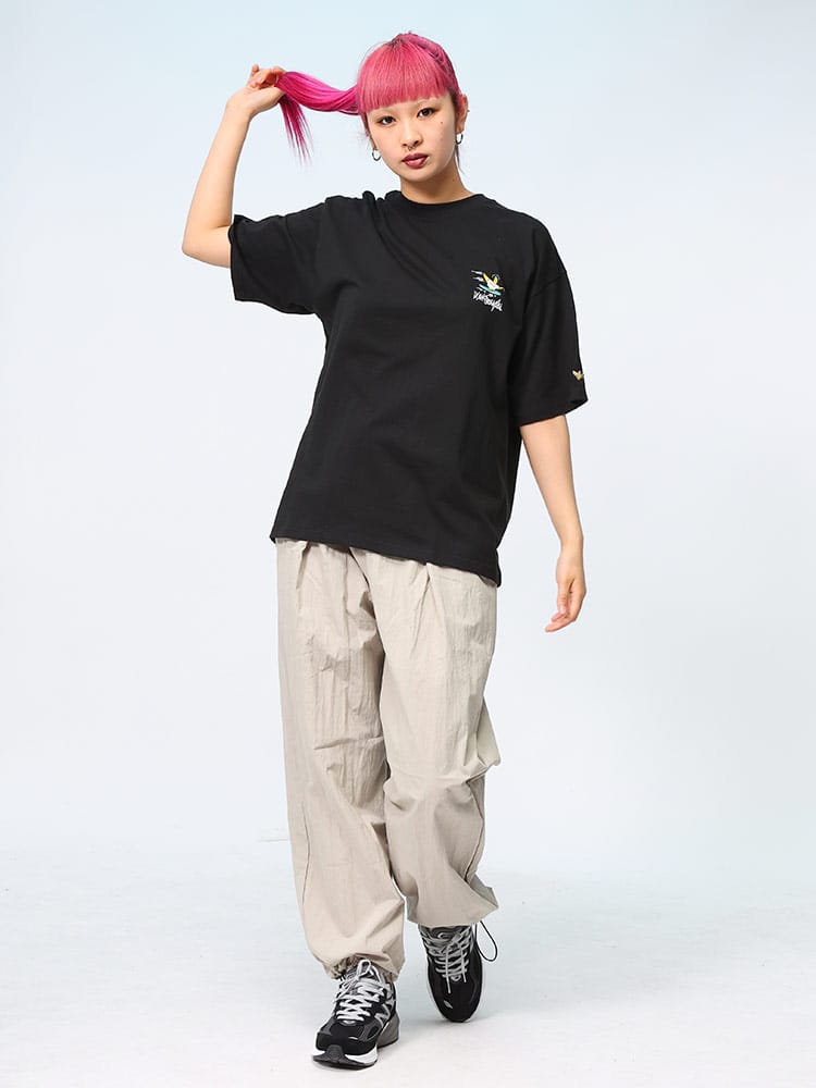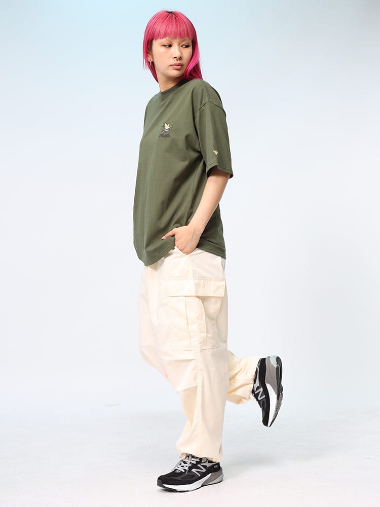 スケートボード界の象徴的人物マーク・ゴンザレスのデザインが特徴的なユニセックスアイテムです。クラシックなクルーネックと半袖の形状に、背面にはスケートボードをテーマにした「スケボーバックプリント」が施されています。このプリントは動きのあるスケートシーンをアーティスティックに表現しており、都会的でクリエイティブな雰囲気を醸し出しています。日常のカジュアルスタイルにダイナミックなアクセントを加える一枚です。