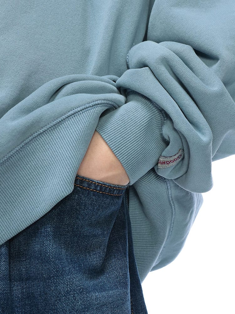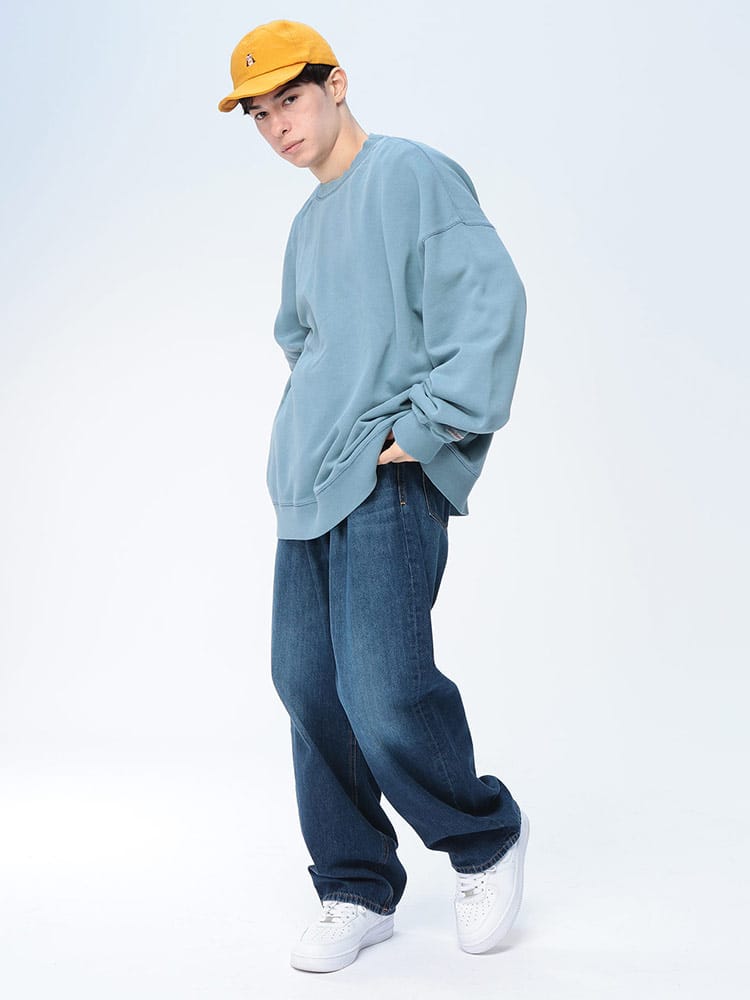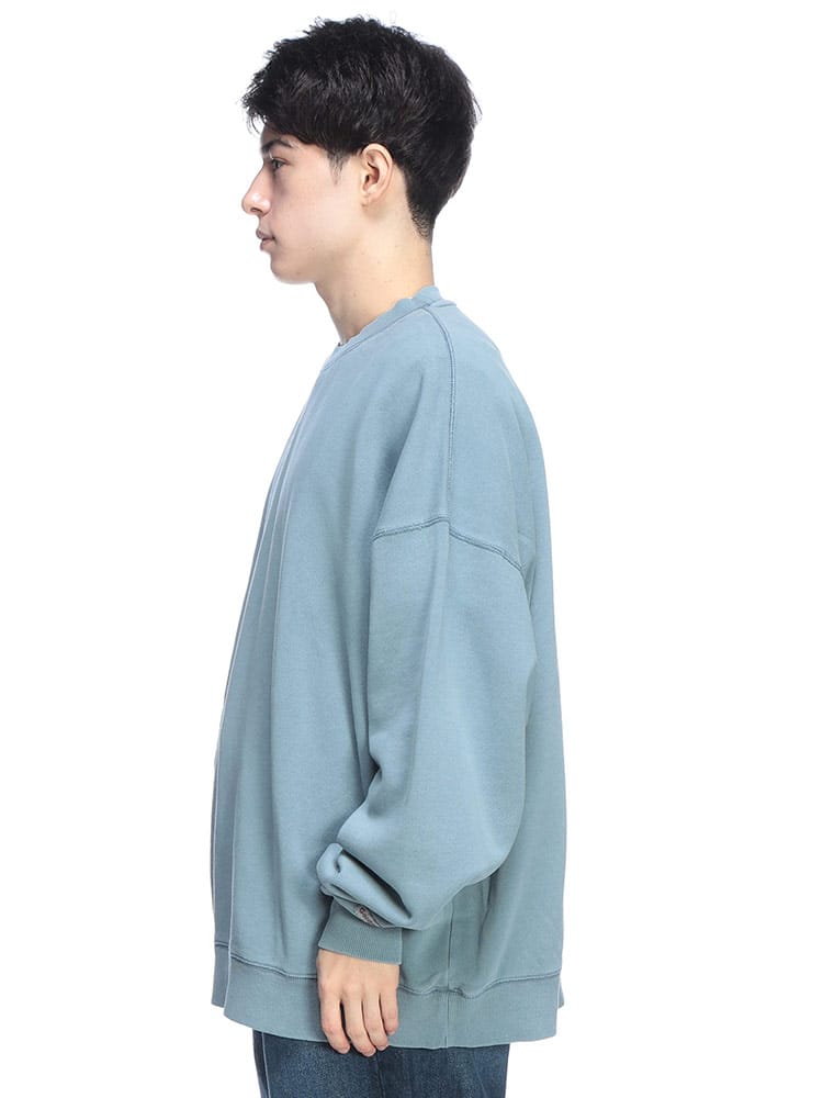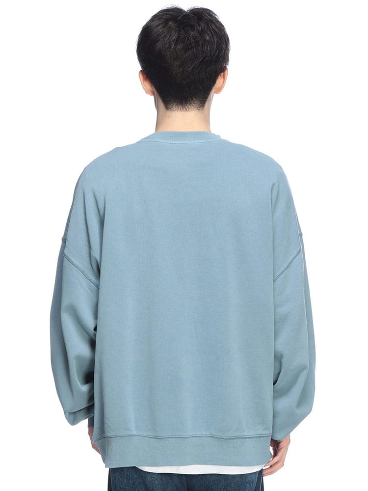 タフなUSAコットン100%の裏毛ボディを、手間暇かけた製品染めで仕上げたクルーネックトレーナー。染色の工程で生まれる絶妙な色ムラやアタリが、まるで長年着込んだようなヴィンテージライクな表情を醸し出します。トレンドのオーバーサイズシルエットは、肩を落としたルーズな着こなしで、こなれたストリート感を演出。肉厚な生地感と、リブにポリウレタンを混紡した耐久性のある作りで、ヘタれることなく長く愛用いただけます。唯一無二の風合いを育てながら楽しむ、秋冬の主役級アイテムです。