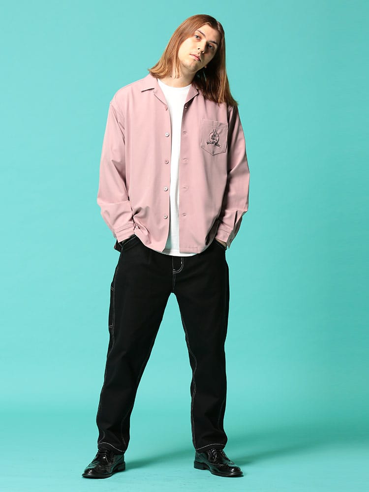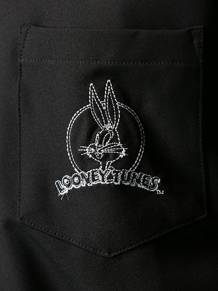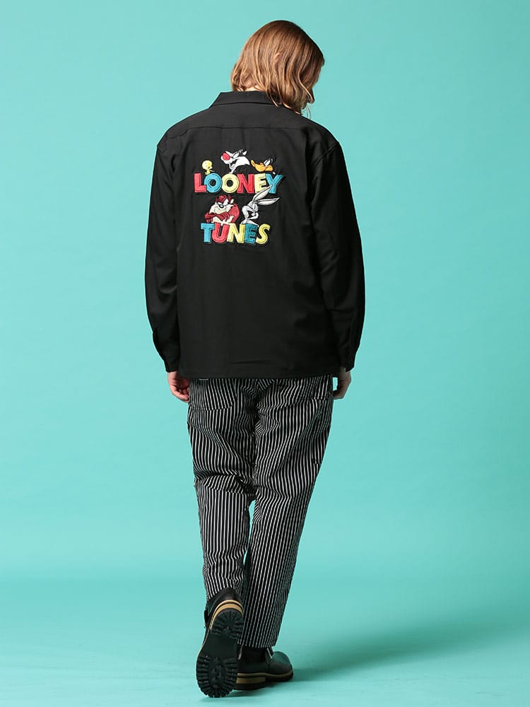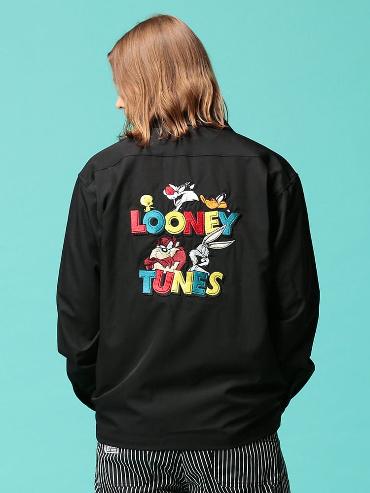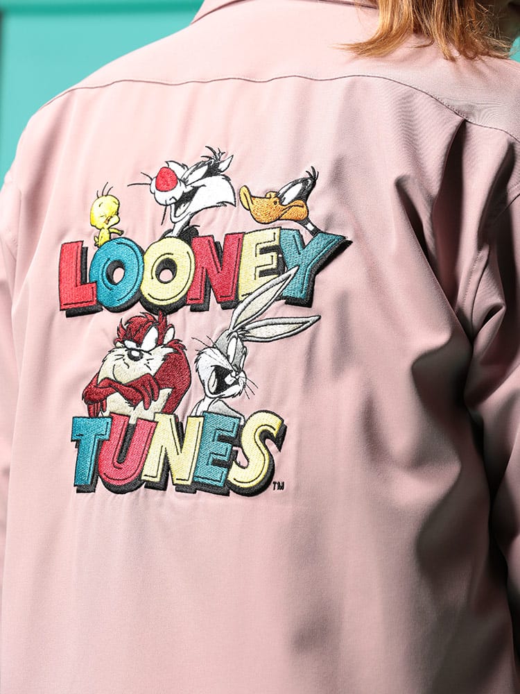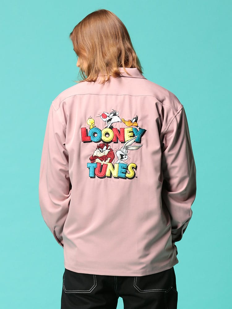 LOONEYTUNESの刺繍がポップなオープンカラー シャツです。バックのキャラクター刺繍が目を引くデザイン。首元は程よいこなれ感を演出するオープンカラーデザイン。裾サイドにスリット入り。サラッとした肌触りで着心地抜群です。サッと羽織るだけでお洒落に決まるアイテムです。