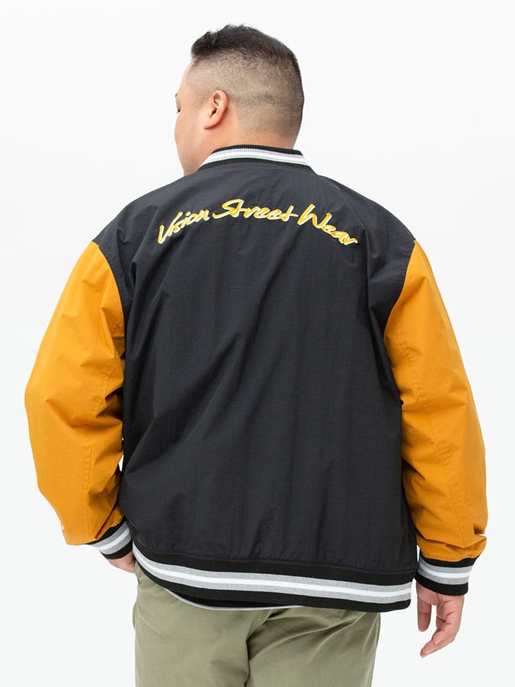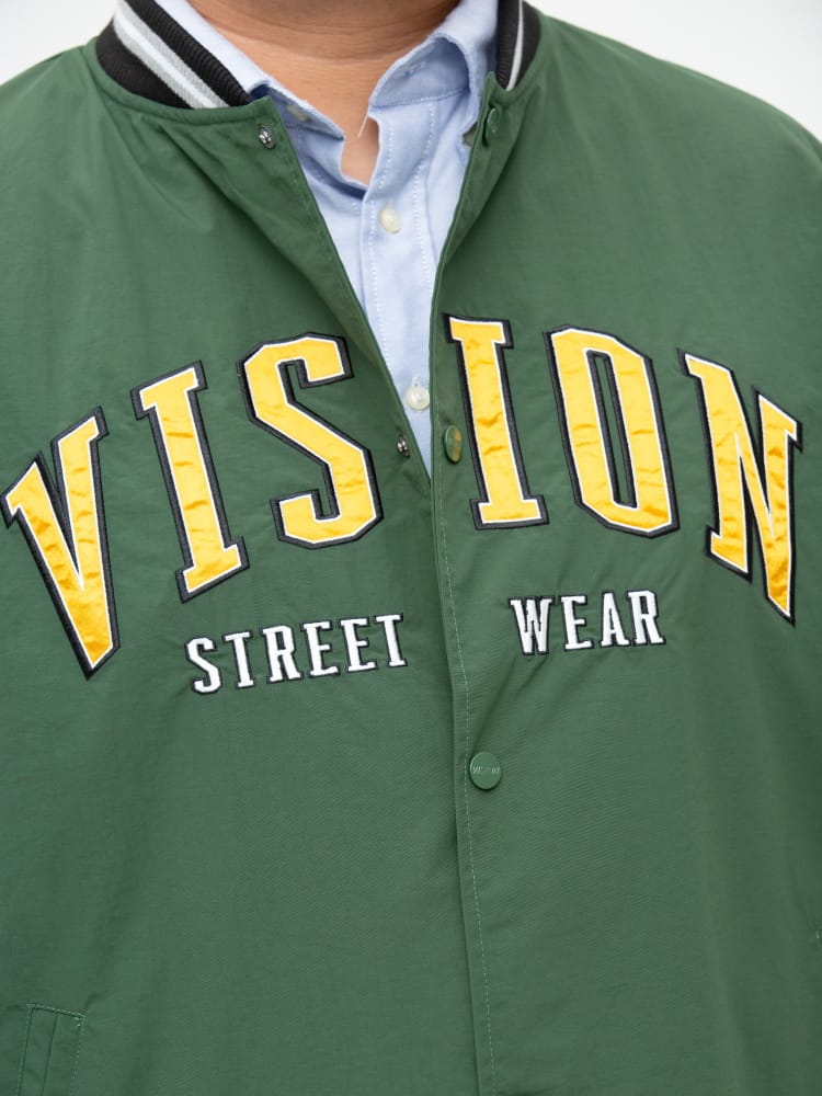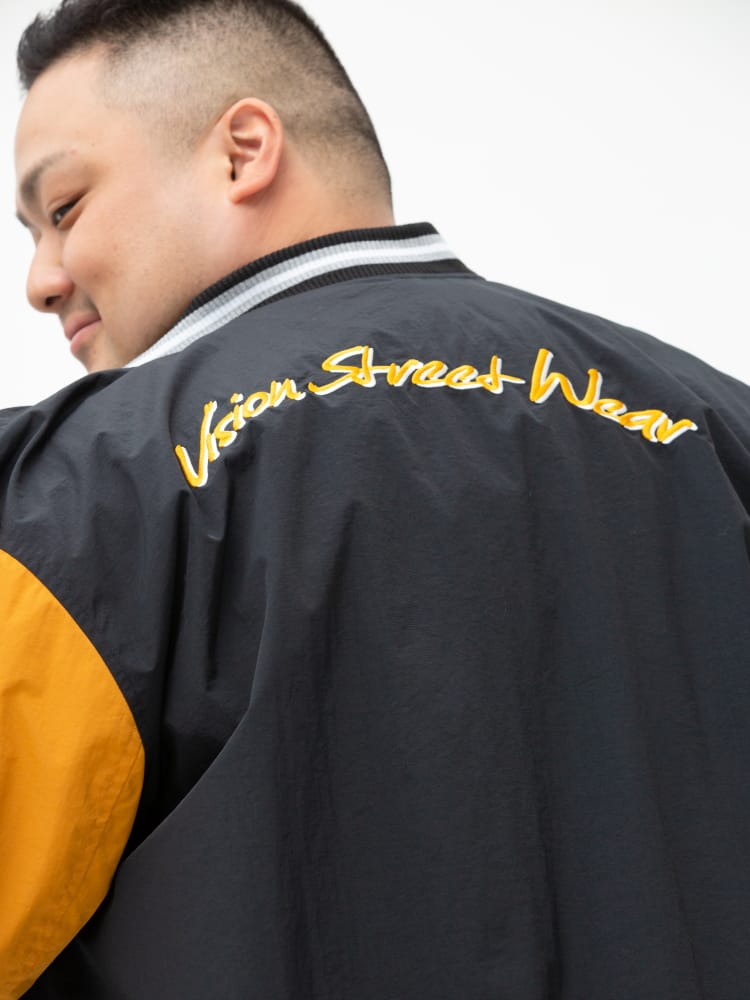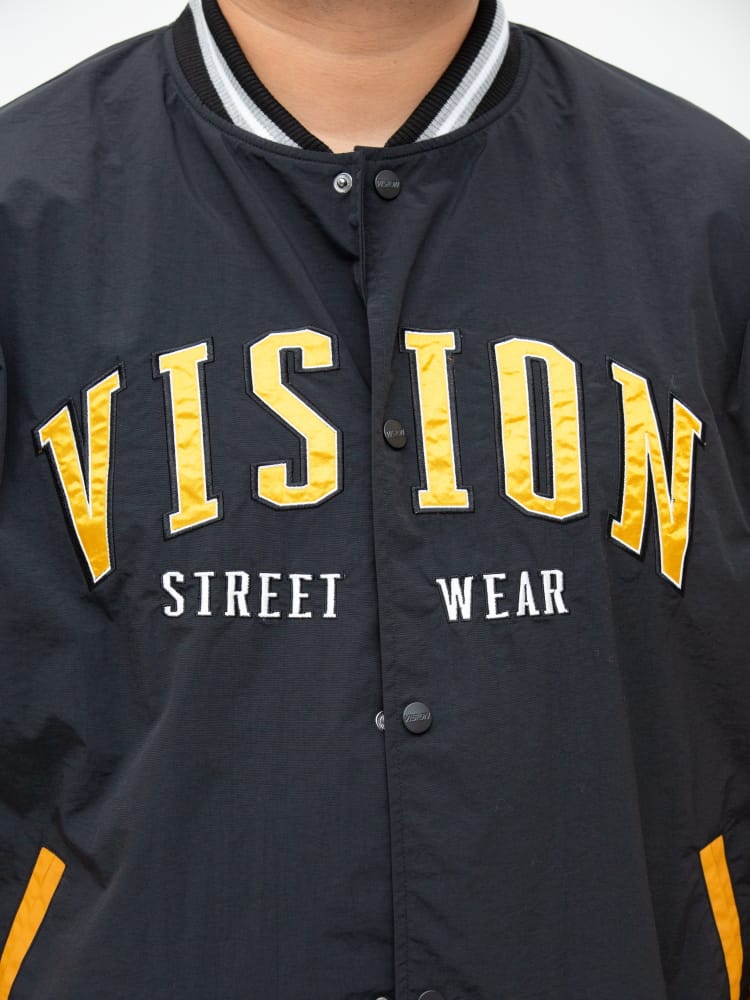 ナイロンで仕上げたVISION STREET WEARのワッペン 刺繍 フルボタン スタジャン。フロントとバックのロゴワッペンが目を引くデザイン。左袖にブランドタグ付き。首元、袖、裾はリブデザイン。フロントのスナップボタンにはロゴの刻印入り。