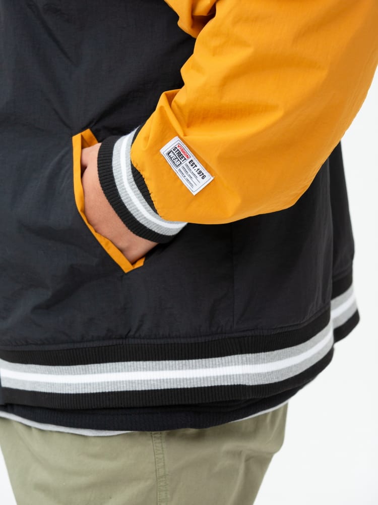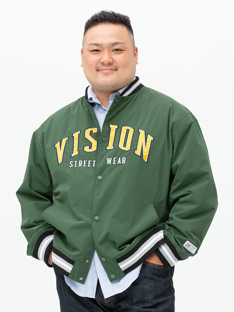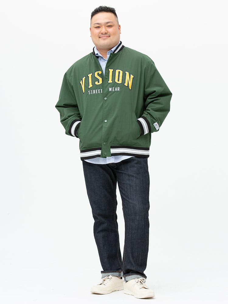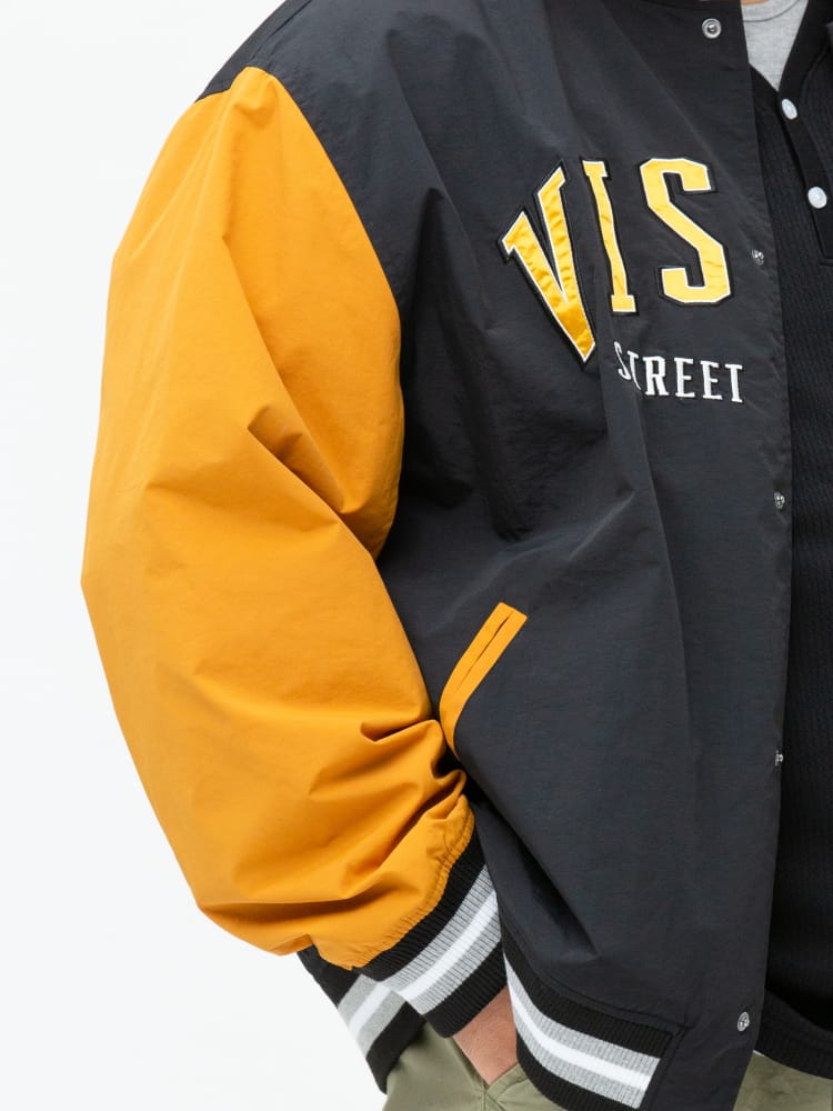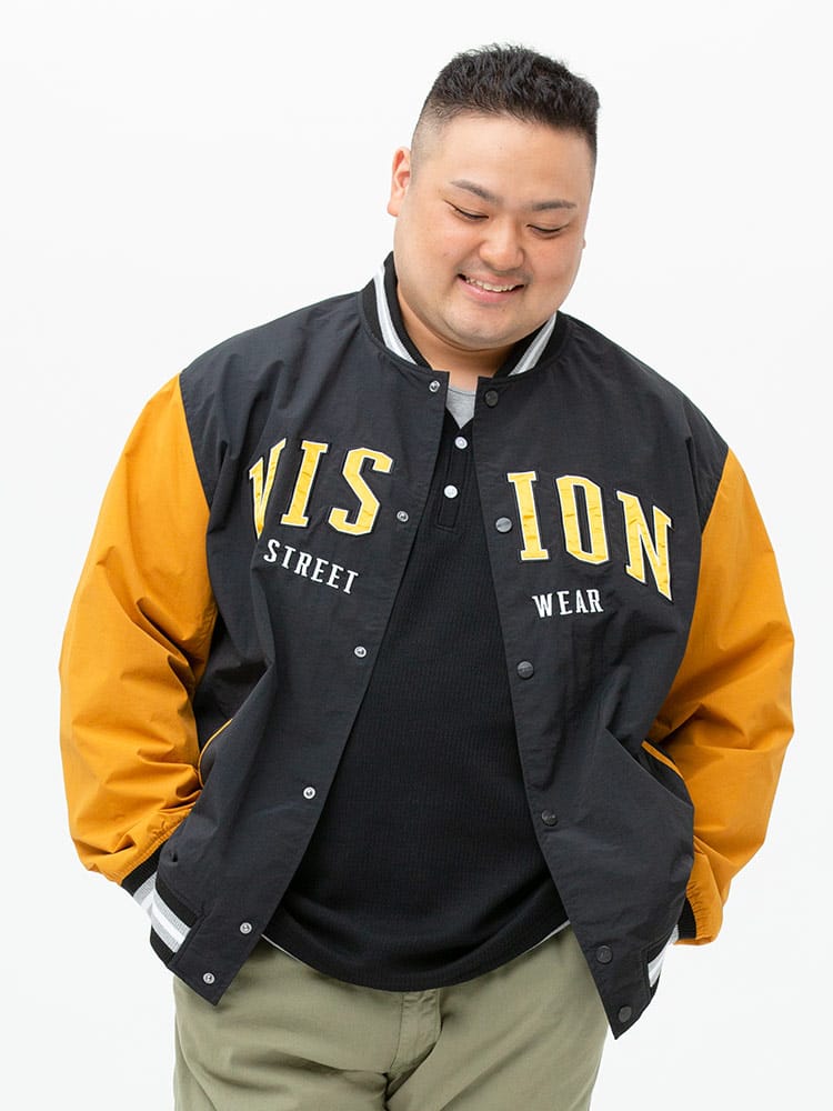 ナイロンで仕上げたVISION STREET WEARのワッペン 刺繍 フルボタン スタジャン。フロントとバックのロゴワッペンが目を引くデザイン。左袖にブランドタグ付き。首元、袖、裾はリブデザイン。フロントのスナップボタンにはロゴの刻印入り。