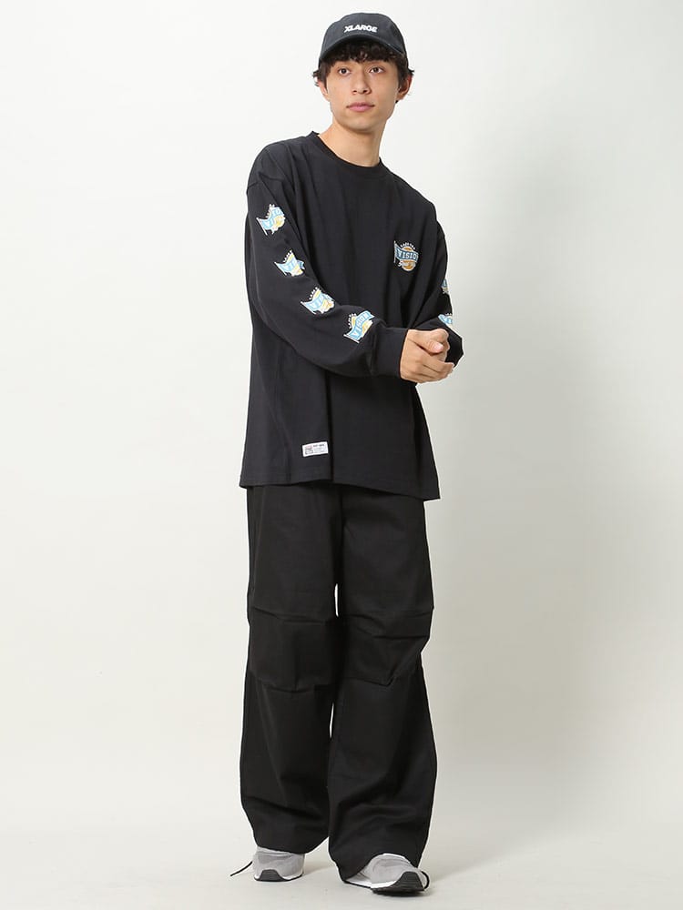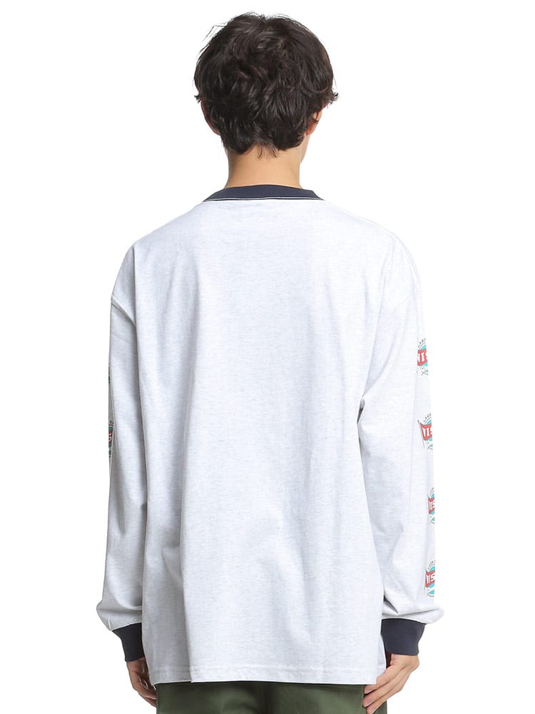 袖プリントが入ったBIGシルエットロンT。一部カラーに配色の効かせたトレンドのリンガータイプを展開。袖にプリントが入っているので、ベストなどの軽アウターとのコーデに相性抜群な1枚!FRONTロゴは自慢の刺繍で仕上げております。しっかりとした肉感で一枚でも着やすいアイテムです。