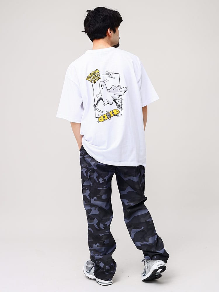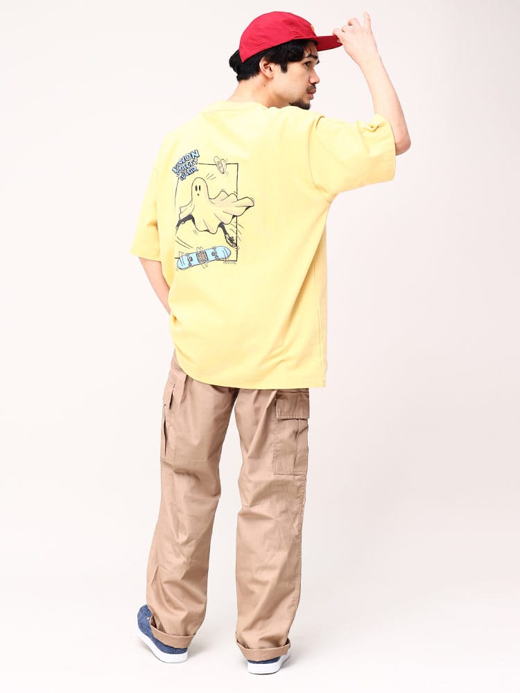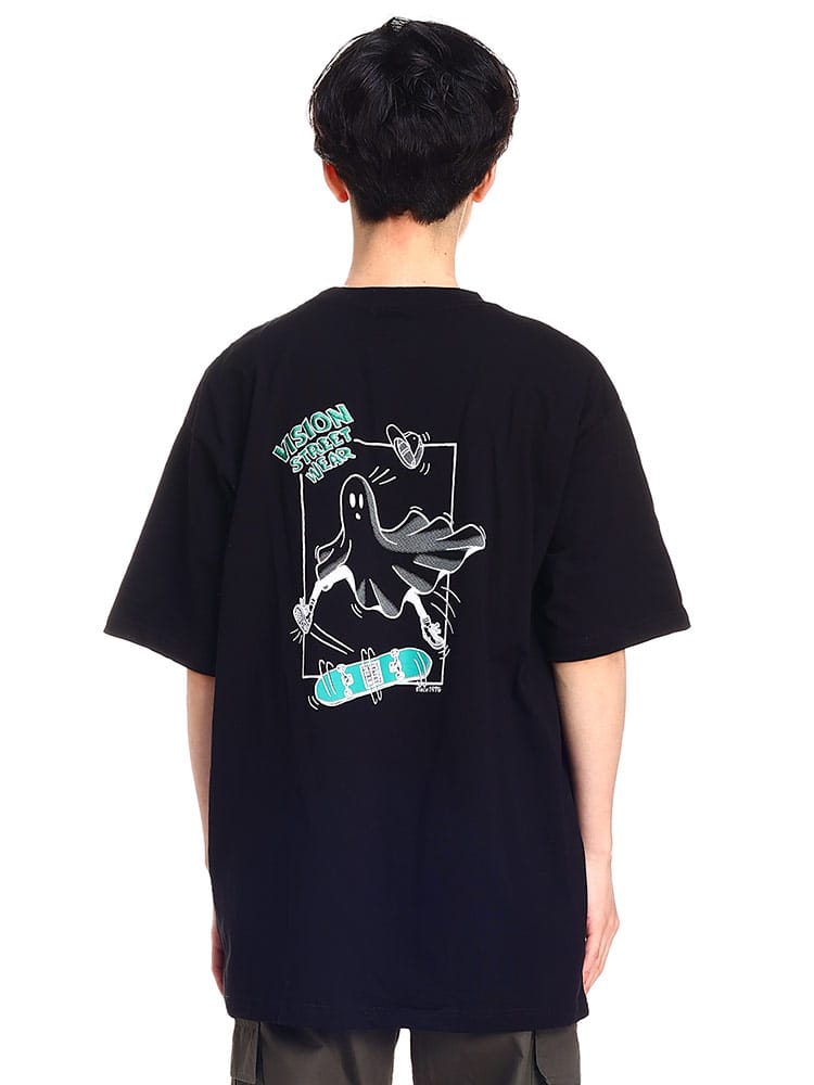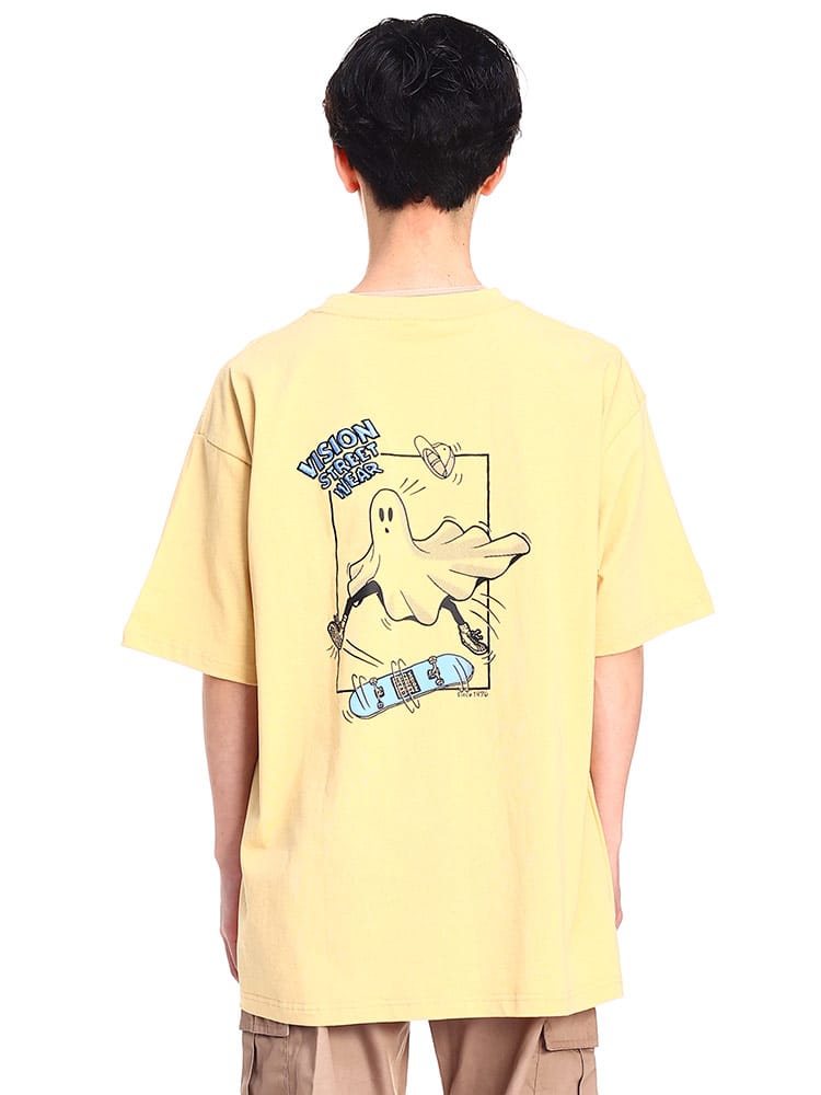 ストリートカジュアルスタイルの定番ブランドのヴィジョンから、ゴーストスケーター クルーネック 半袖 Tシャツです。フロント左胸に小さくロゴ刺繍が施され、バックにはコミカルなゴーストのイラストが大胆に描かれたデザイン。スケーターファッションに最適な、オーバーサイズでの着用がおすすめ。