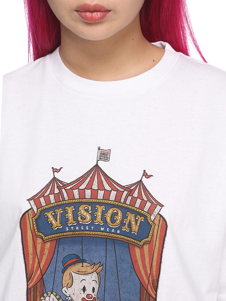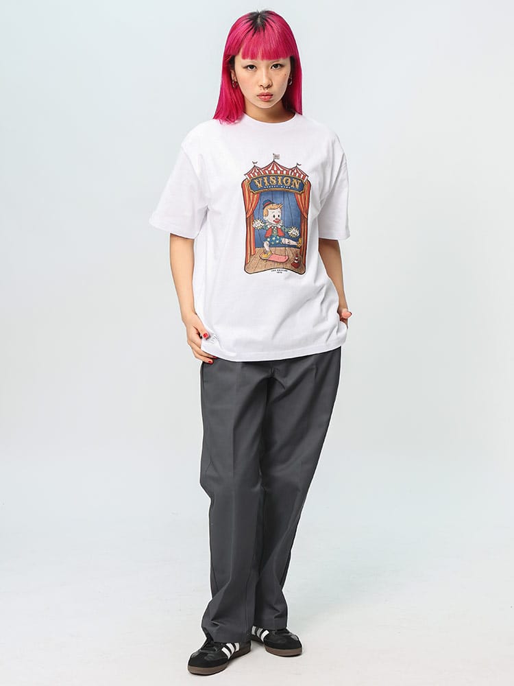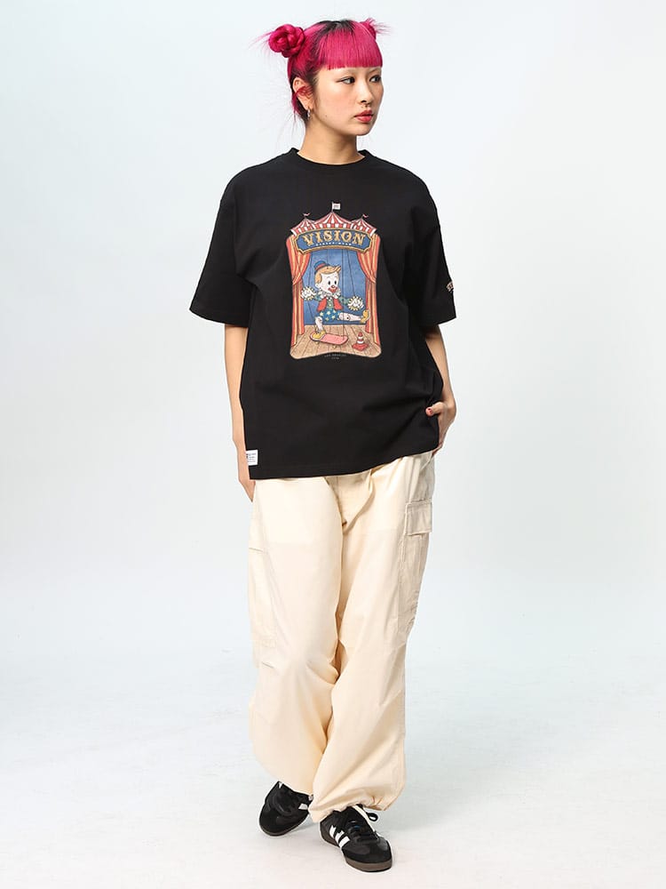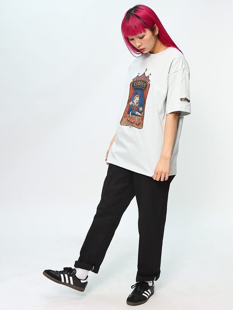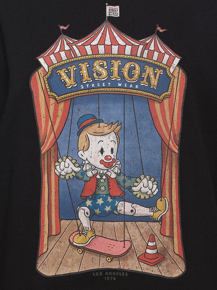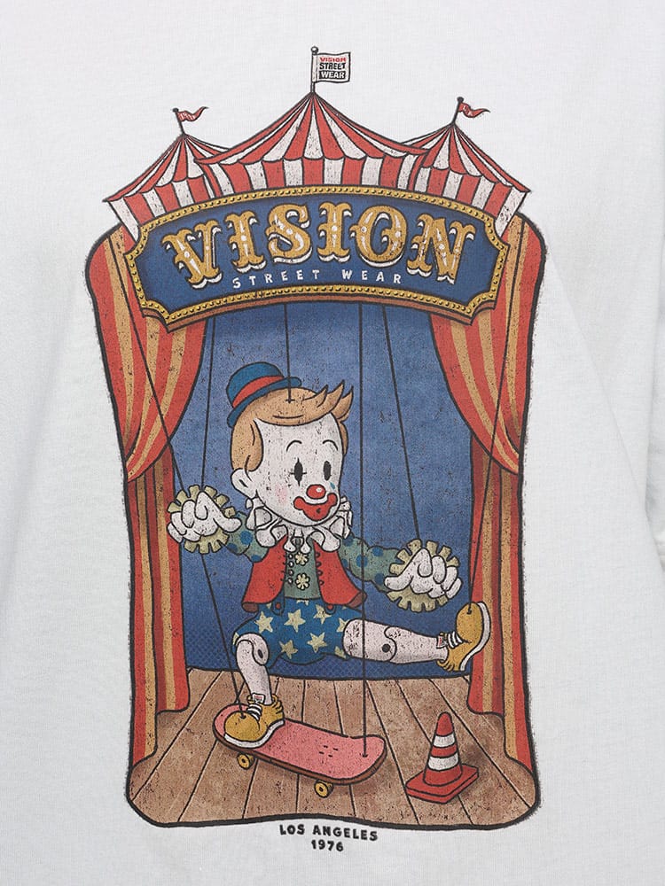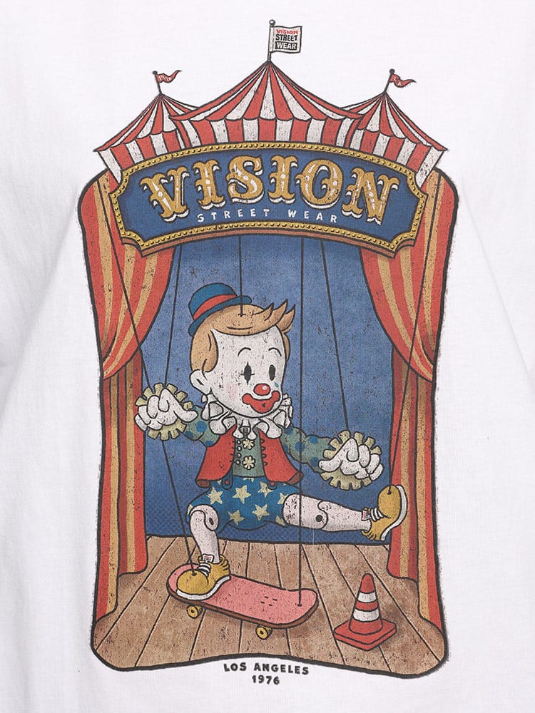 VISION STREET WEARの半袖Tシャツは、サーカステントでスケボーに乗るピエロのマリオネットを描いたユニークなフロントプリントが特徴です。この斬新なデザインは、ストリートウェアの枠を超えた創造性を表現し、個性的でアーティスティックなスタイルを好む人々に最適なアイテムです。