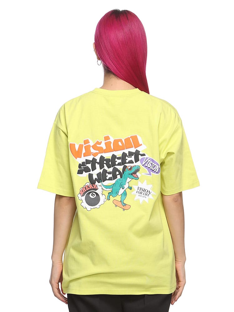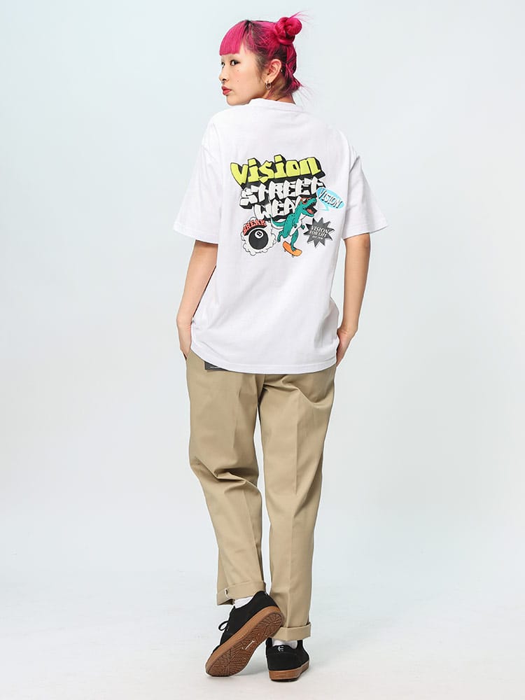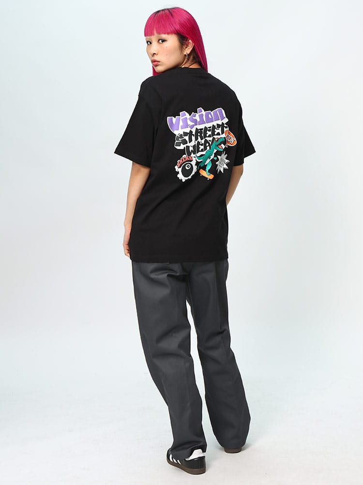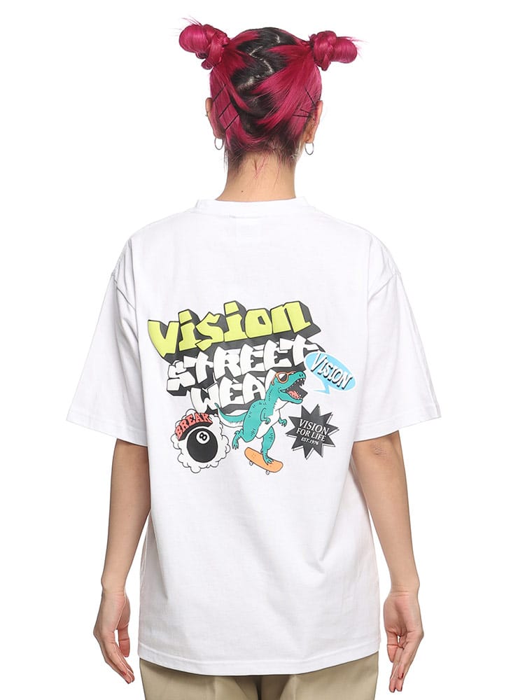 VISION STREET WEARの半袖Tシャツは、バックにグラフィカルなブランドロゴとスケボーに乗る恐竜のイラストが描かれたデザインが目を引きます。この個性的でユニークなアートワークは、スタイリッシュなステートメントピースとして際立ちます。
