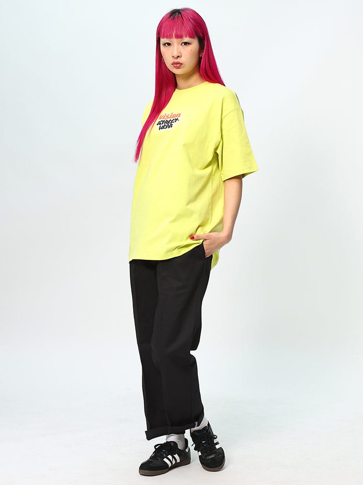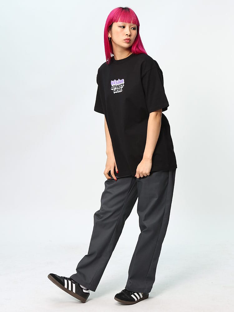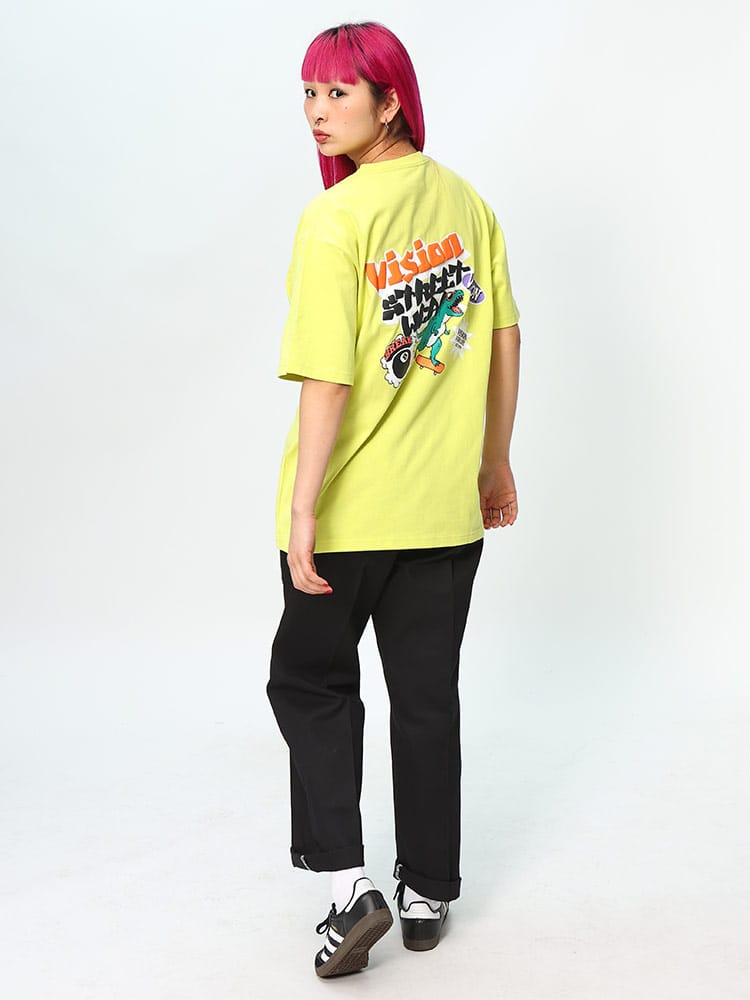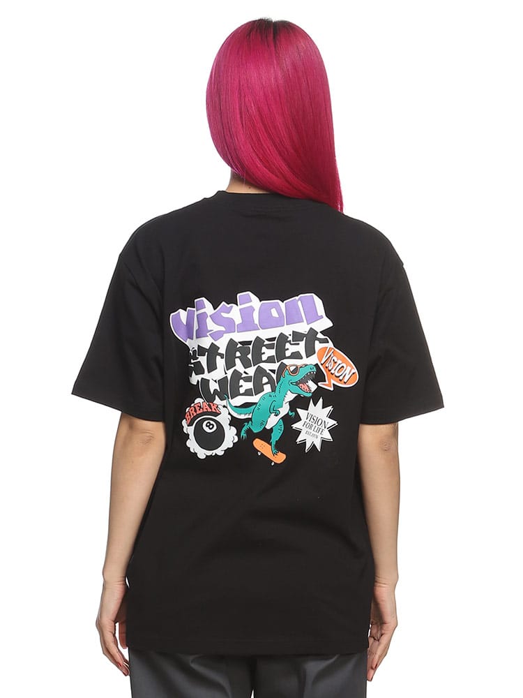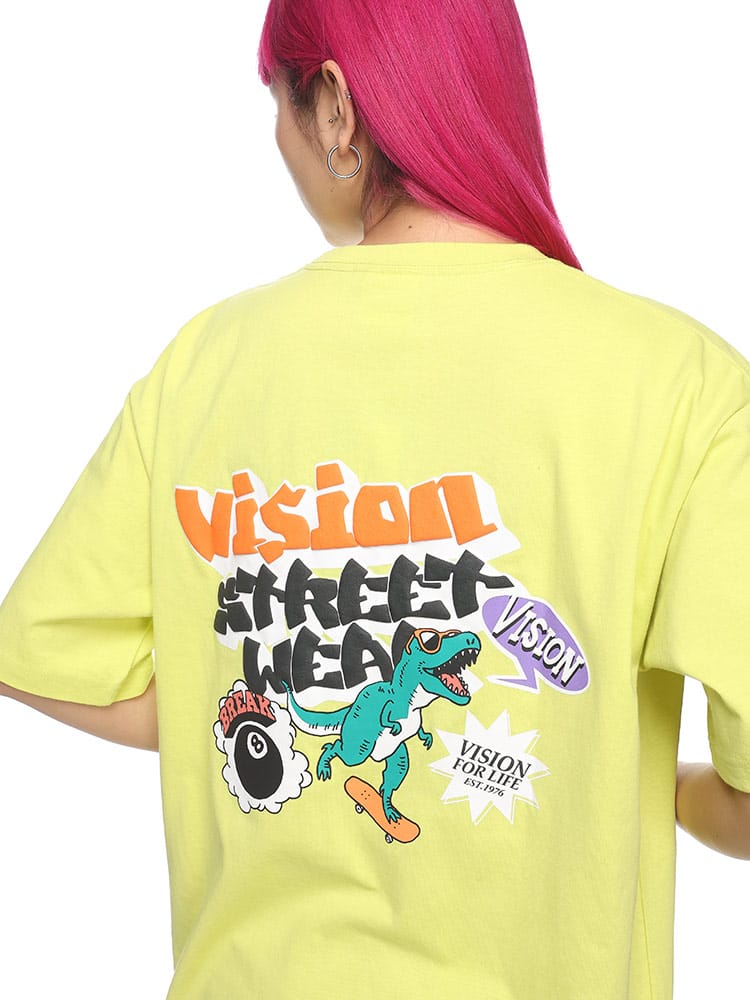 VISION STREET WEARの半袖Tシャツは、バックにグラフィカルなブランドロゴとスケボーに乗る恐竜のイラストが描かれたデザインが目を引きます。この個性的でユニークなアートワークは、スタイリッシュなステートメントピースとして際立ちます。