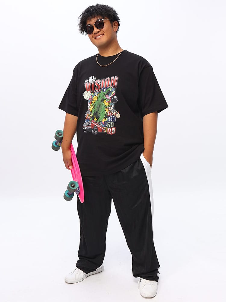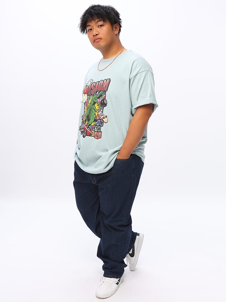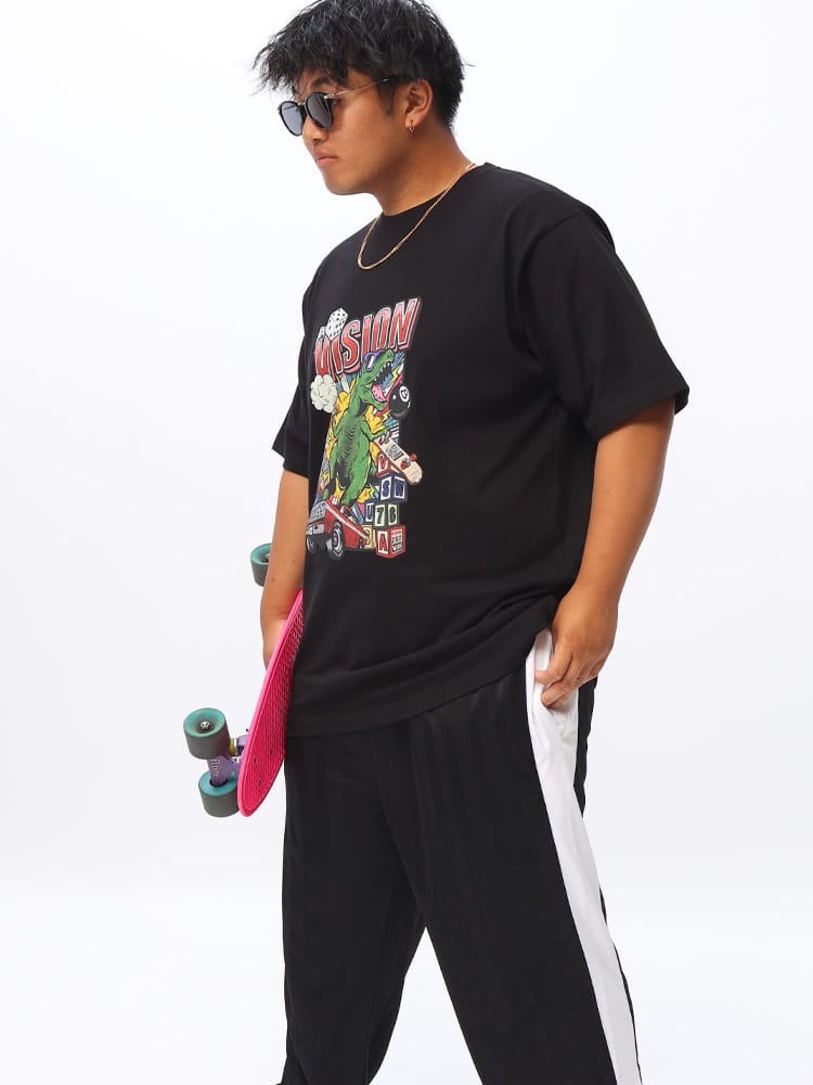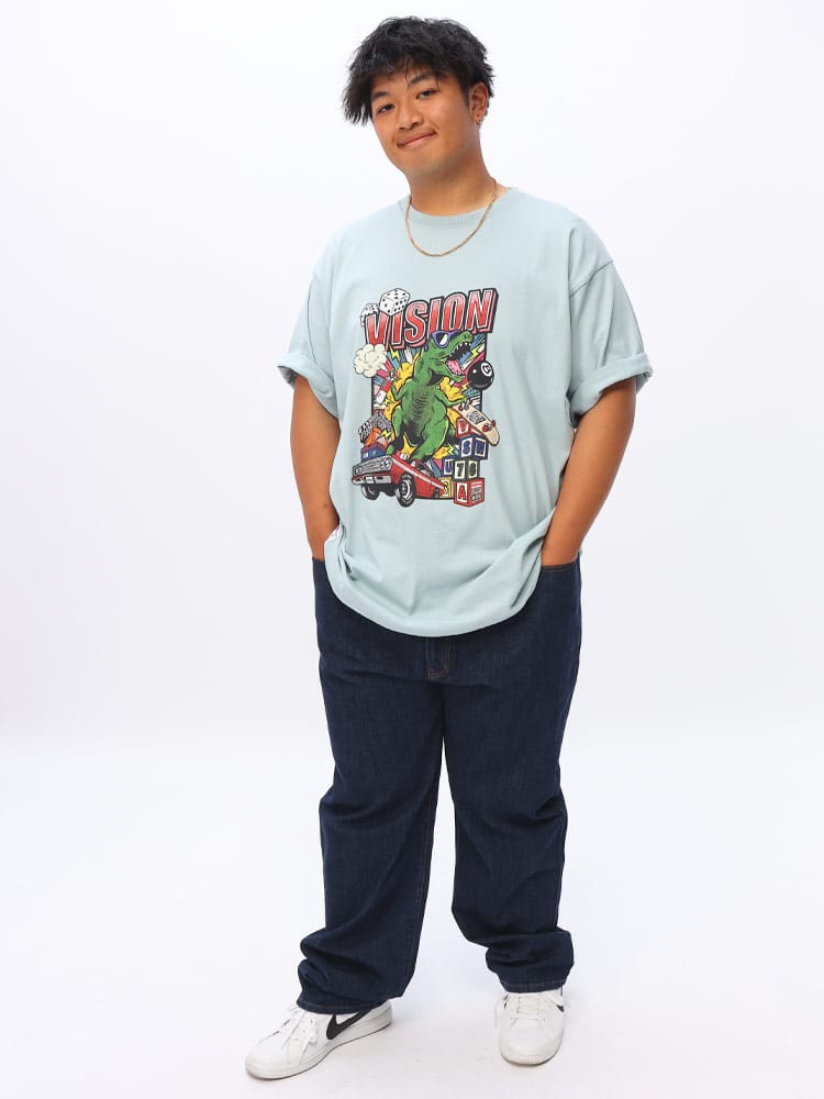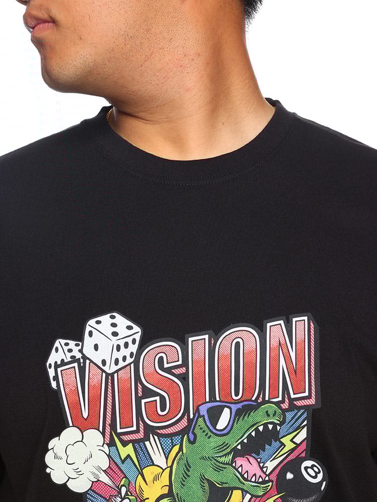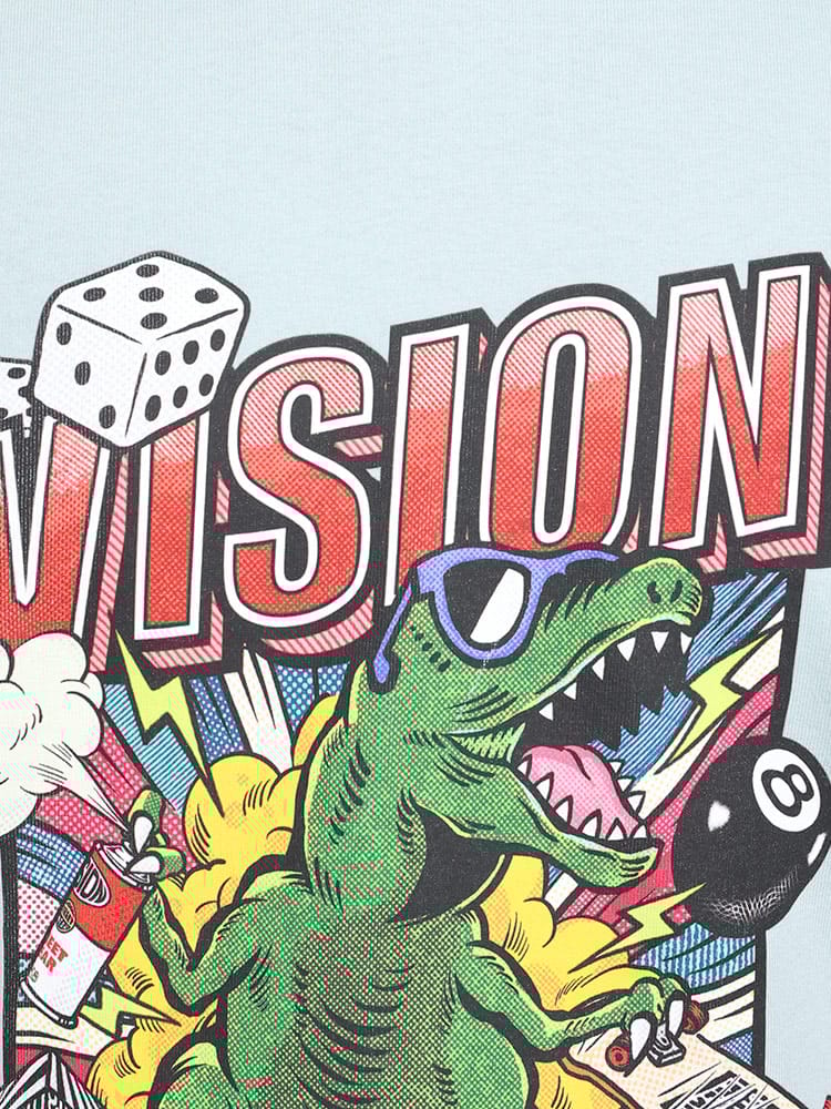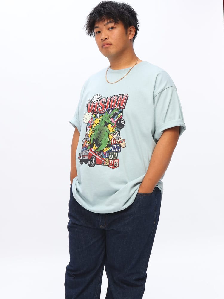 VISION STREET WEAR(ヴィジョンストリートウェア) アメコミダイナソープリント クルーネック 半袖 Tシャツは、アメコミ風のダイナソープリントが特徴のスタイリッシュなTシャツです。ビビッドなグラフィックが目を引き、カジュアルなストリートファッションにぴったりです。