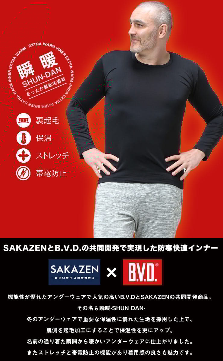 寒いシーズンのインナーウェアとしておすすめしたいHYBRIDBIZ×BVDの瞬暖 裏起毛 クルーネック 長袖 アンダーTシャツ。首元はベーシックなクルーネック。あったか裏起毛素材を使用。保温性に優れ暖かな着心地。伸縮性があり、身体の動きにフィットし快適な着用感です。帯電防止で静電気の発生が少なくパチパチしにくいのもポイントです。