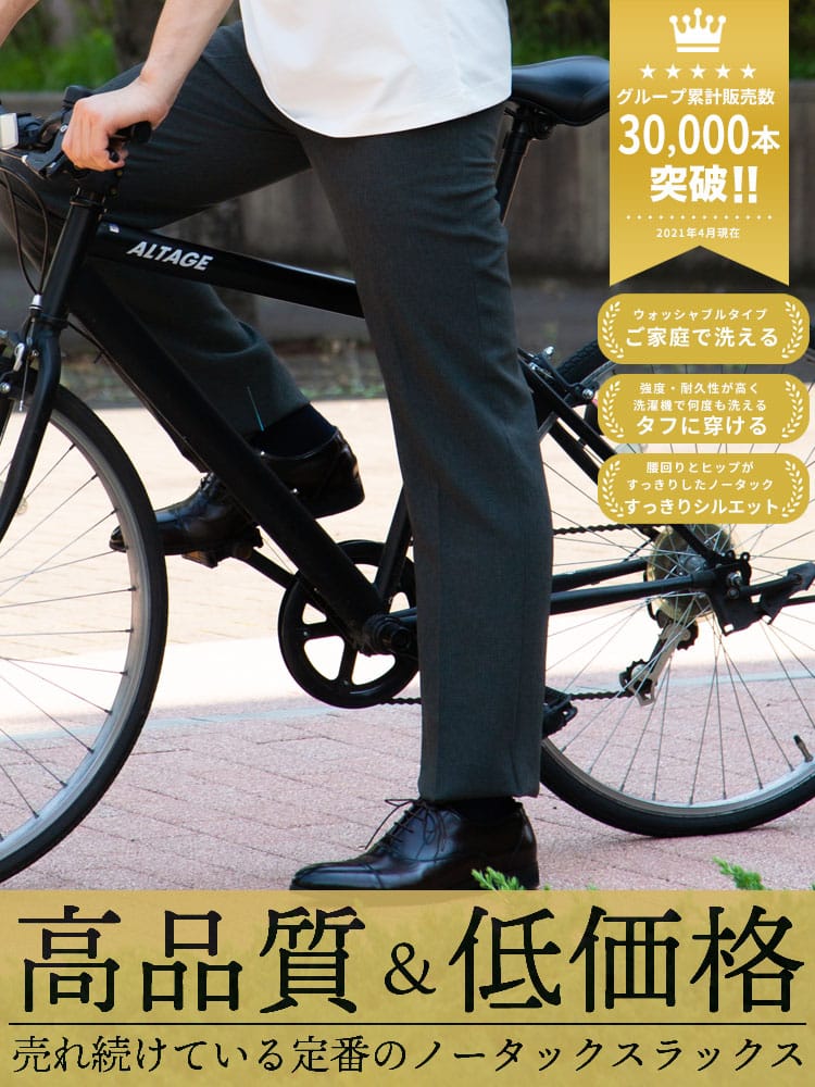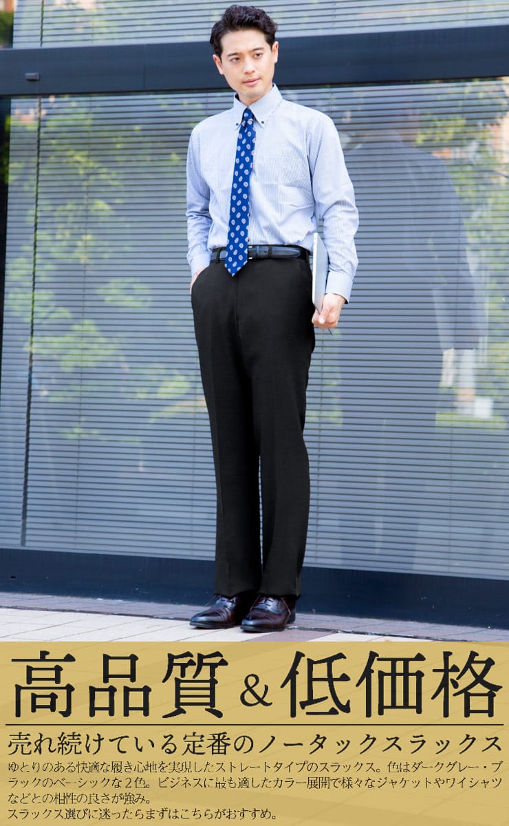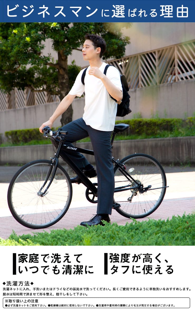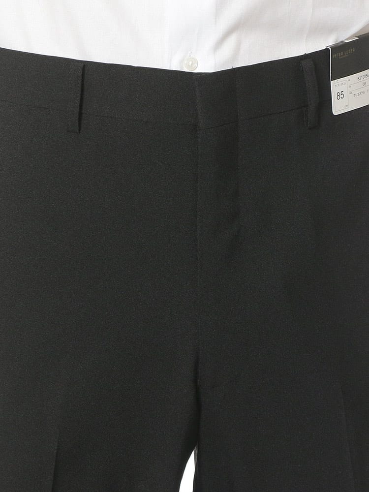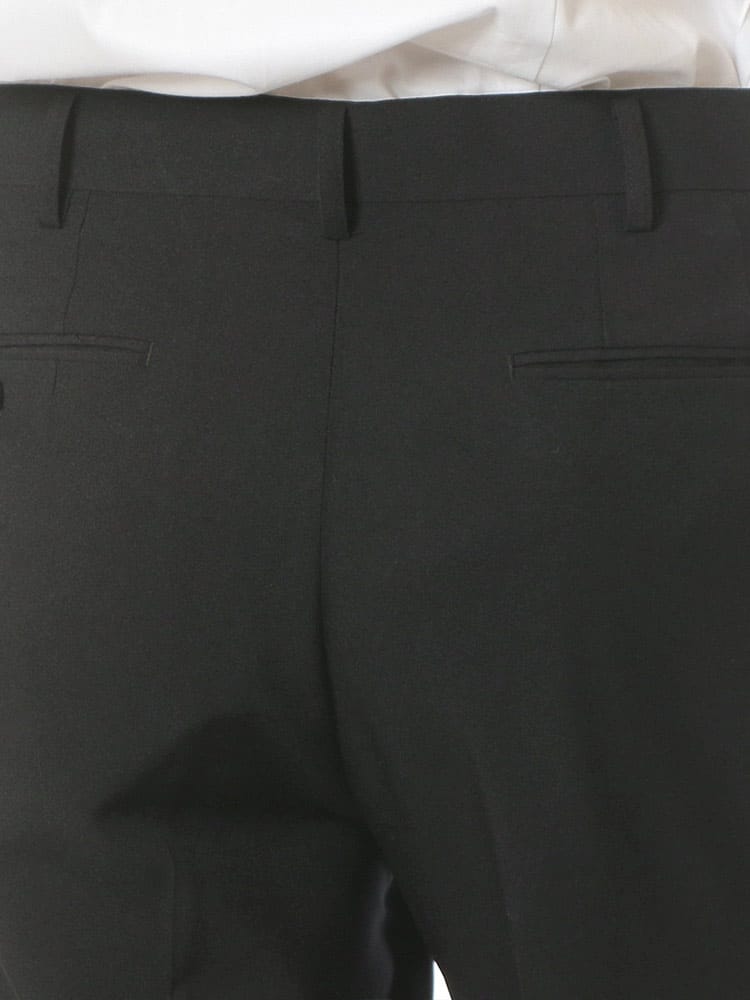 家庭用洗濯機で洗えるウォッシャブルタイプ。ノータックスラックス。生地はポリエステル100%なので綿に比べて乾きやすいです。左ヒップポケットはボタン留め。スタイリッシュに見えるノータック。
