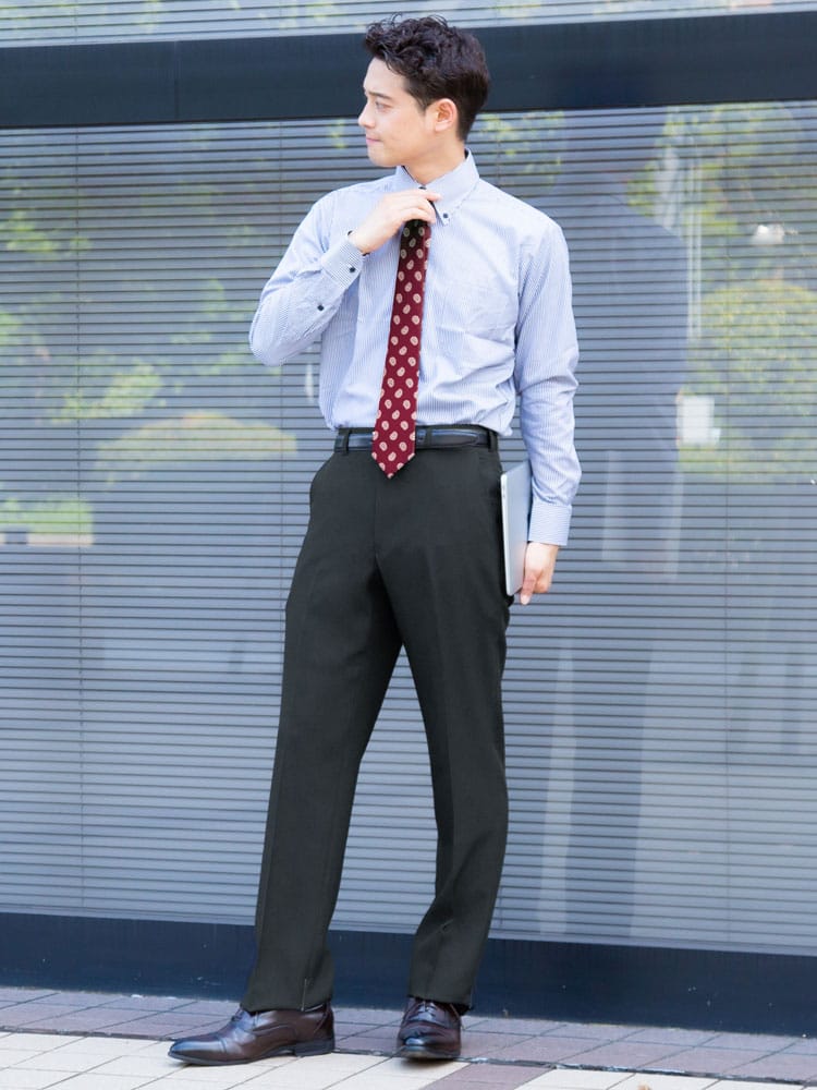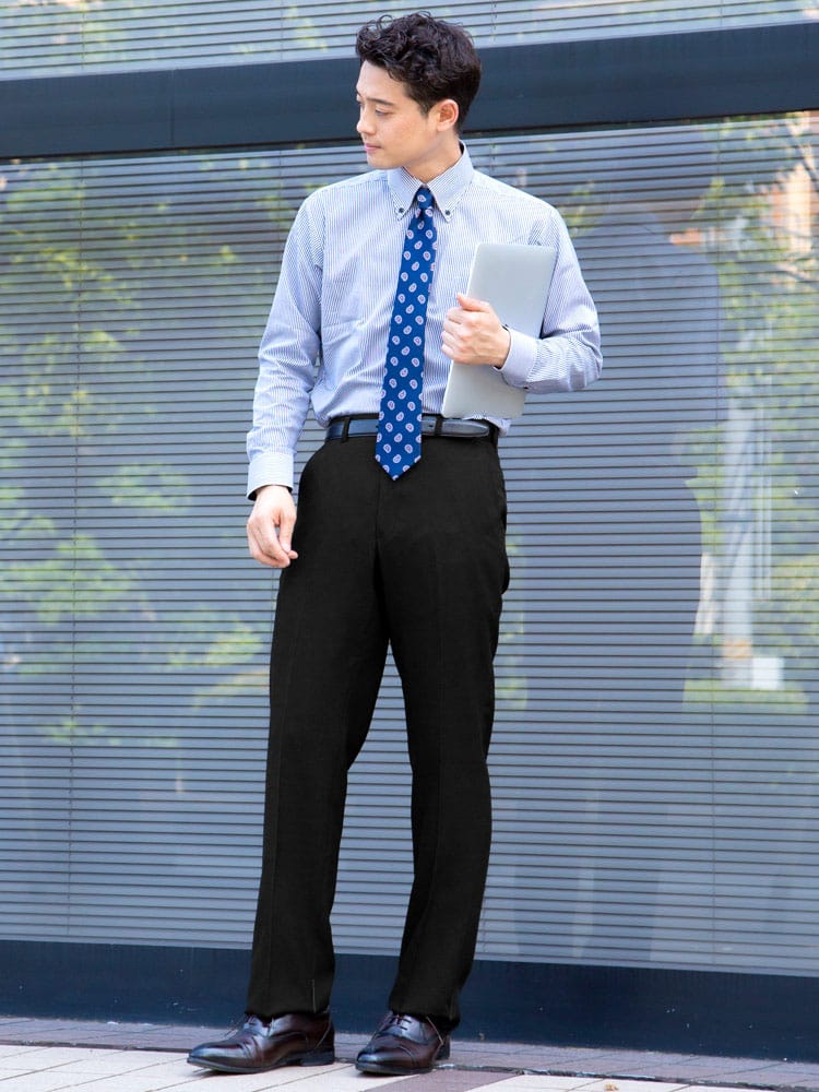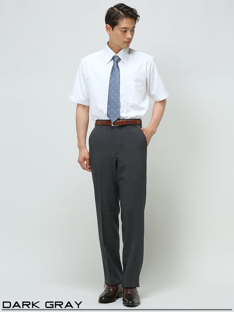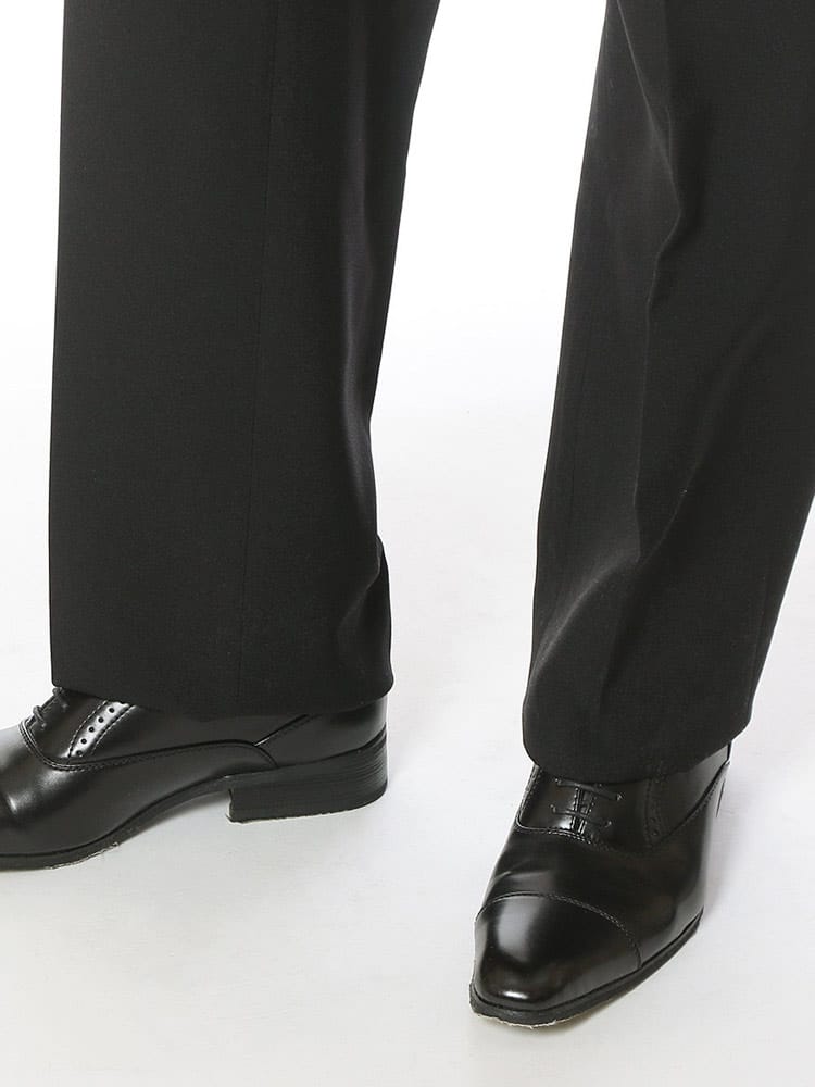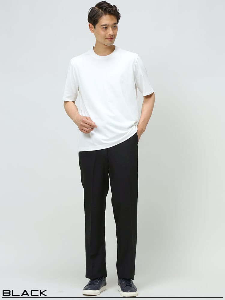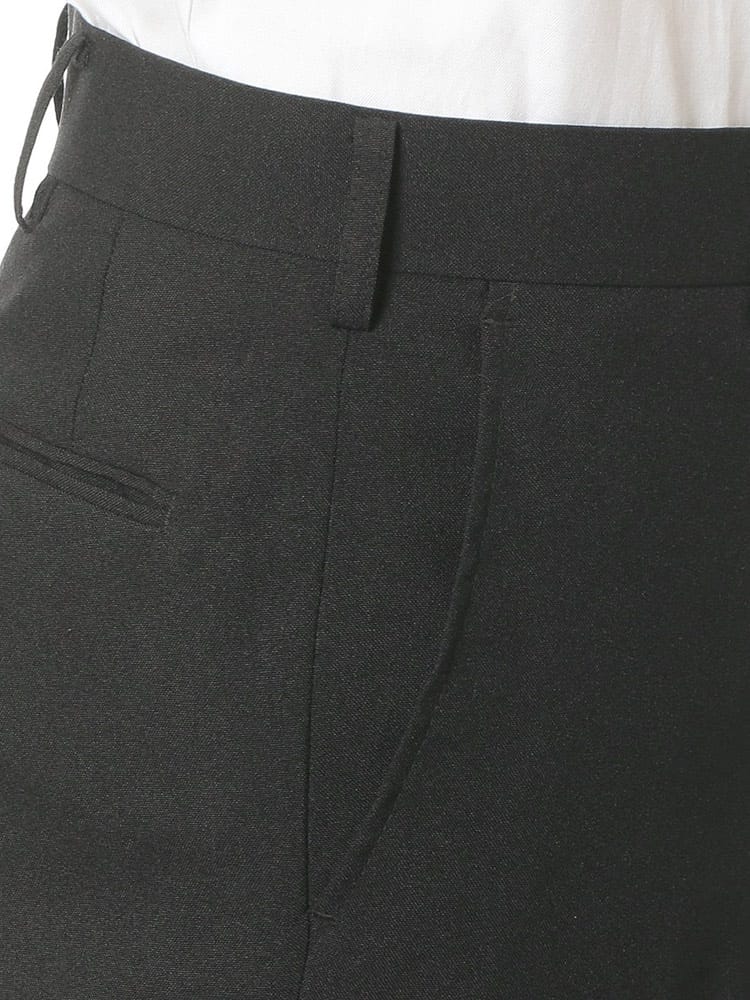 家庭用洗濯機で洗えるウォッシャブルタイプ。ノータックスラックス。生地はポリエステル100%なので綿に比べて乾きやすいです。左ヒップポケットはボタン留め。スタイリッシュに見えるノータック。