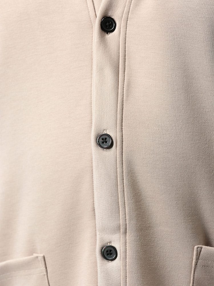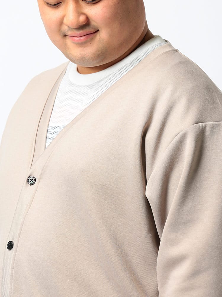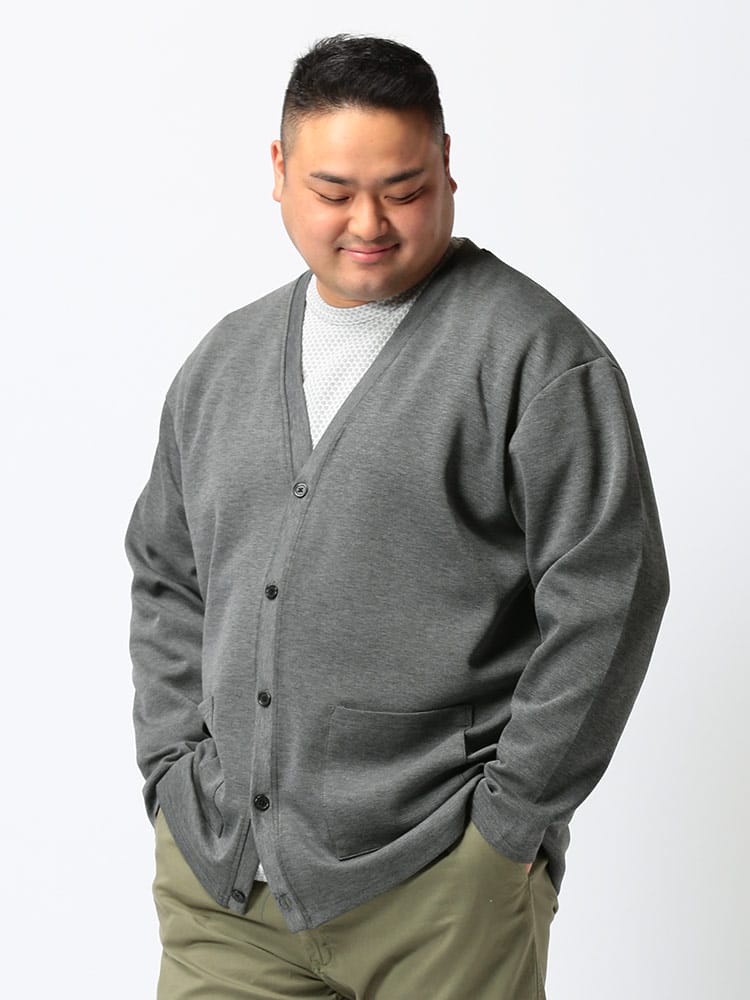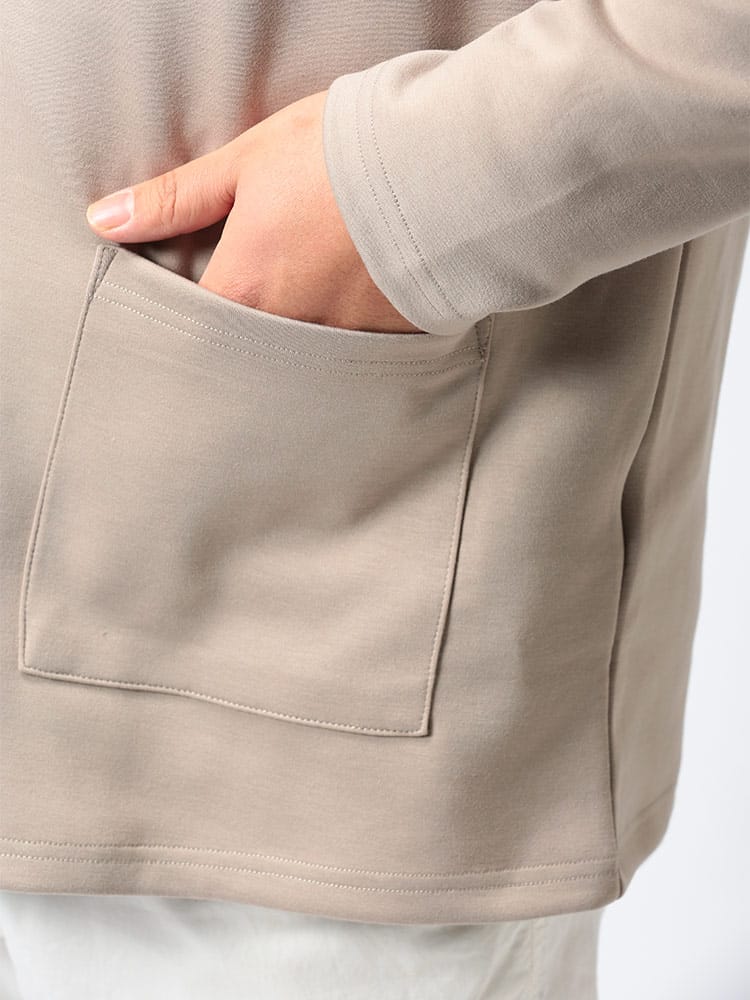 ハリ感がありストレッチ性のあるライトダンボール地を使用したポケット付 長袖 カーディガンです。無地のベーシックなデザイン。フロントにポケット付き。落ち着いたデザインで大人のカジュアルスタイルにおすすめの1着です。