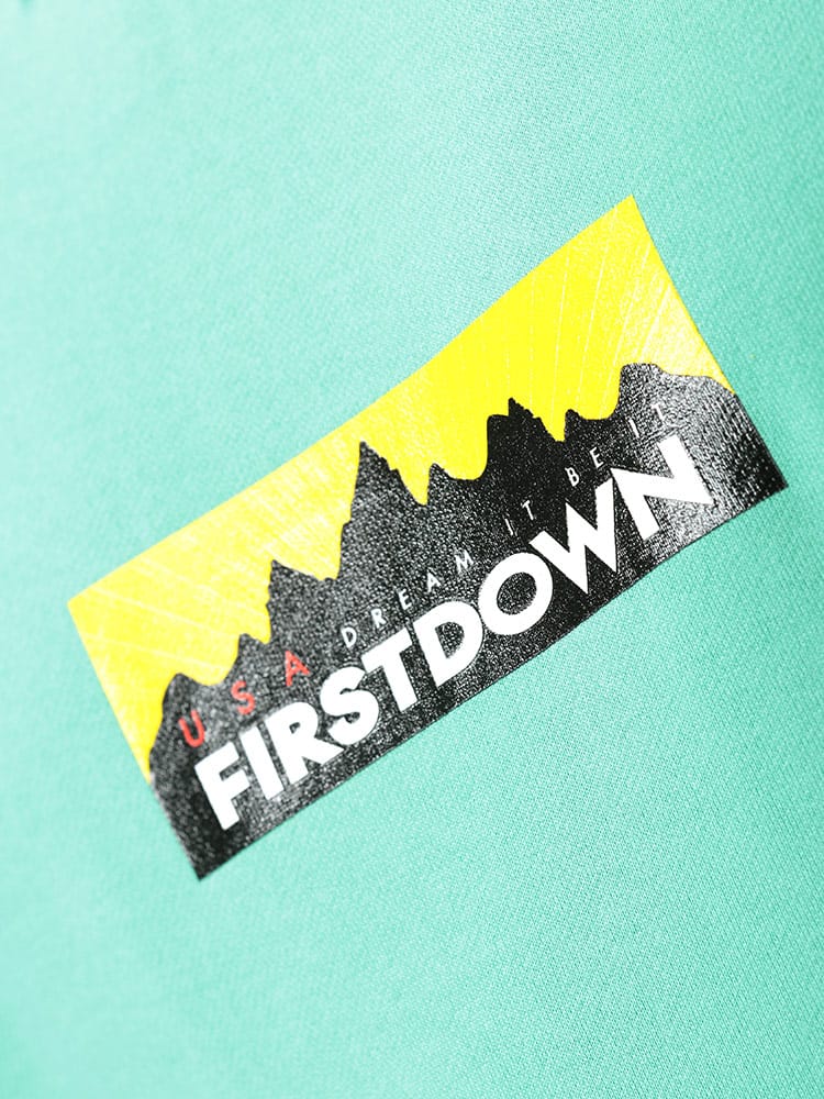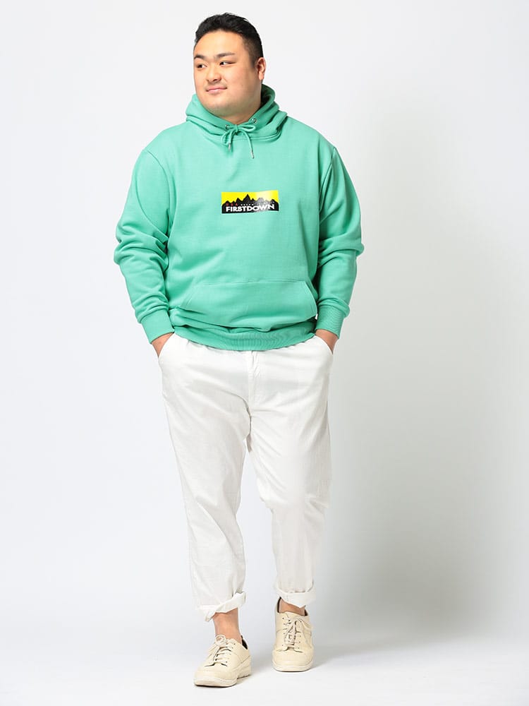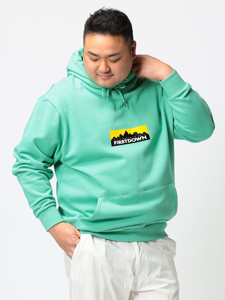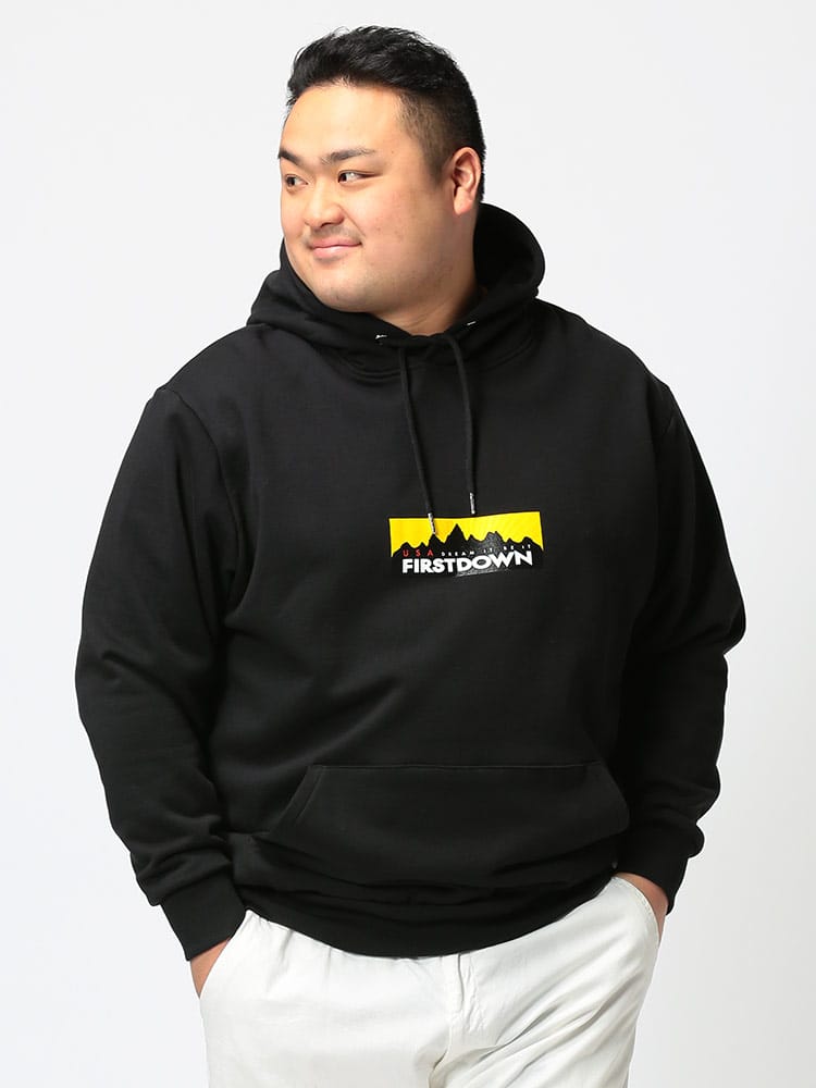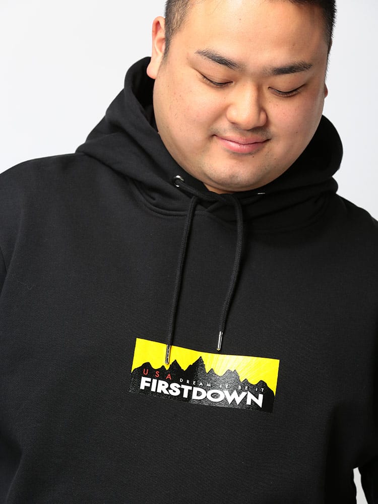 FIRST DOWN USAのBOXロゴプリント フード スウェット プルオーバー パーカー。フロントのBOXロゴプリントがキャッチーなデザイン。左裾にタグ付き。袖、裾はリブデザイン。タフで良質なコットン生地でガシガシ着ていただけます。アウトドアやアメカジスタイルにおすすめのアイテムです。