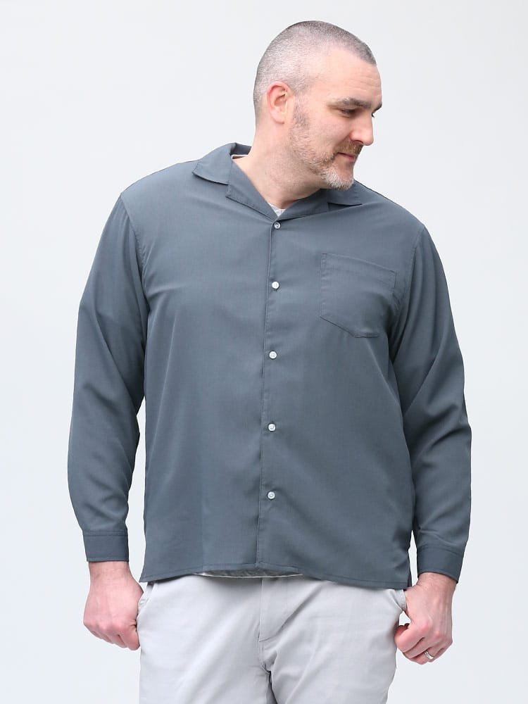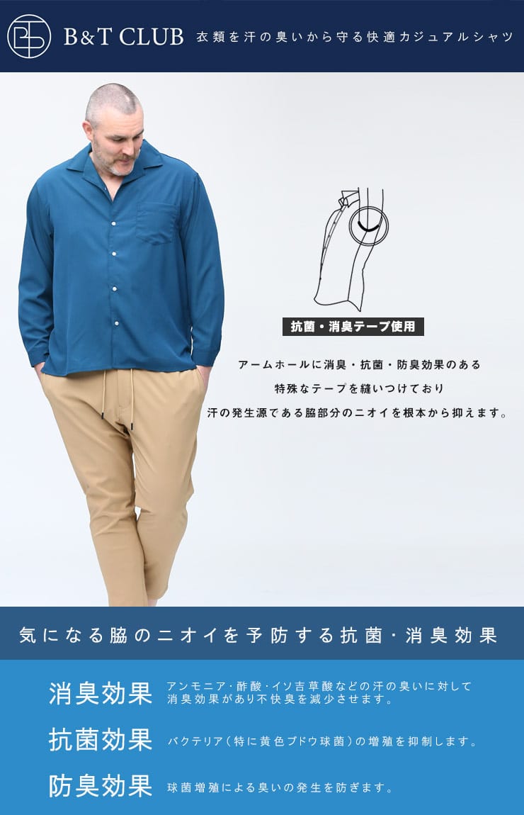 無地の開襟デザインの長袖 シャツです。無地デザインでどんなスタイルにも取り入れていただけます。ストレッチ性あるアイテム。裾サイドにスリット入り。脇下の備えた抗菌消臭テープで【消臭】【抗菌】【防臭】の3つの効果を発揮してくれます。外出の際の汗の臭いを抑えて、人込みでの周囲への気遣いによるストレスを軽減してくれます。