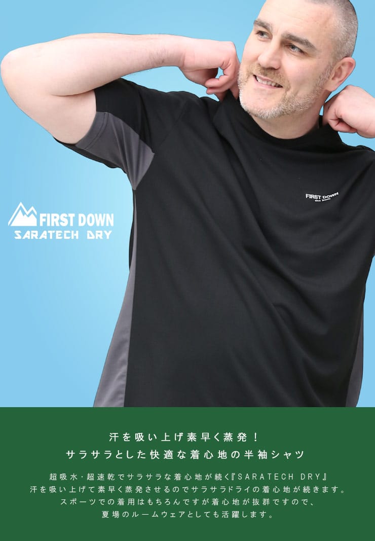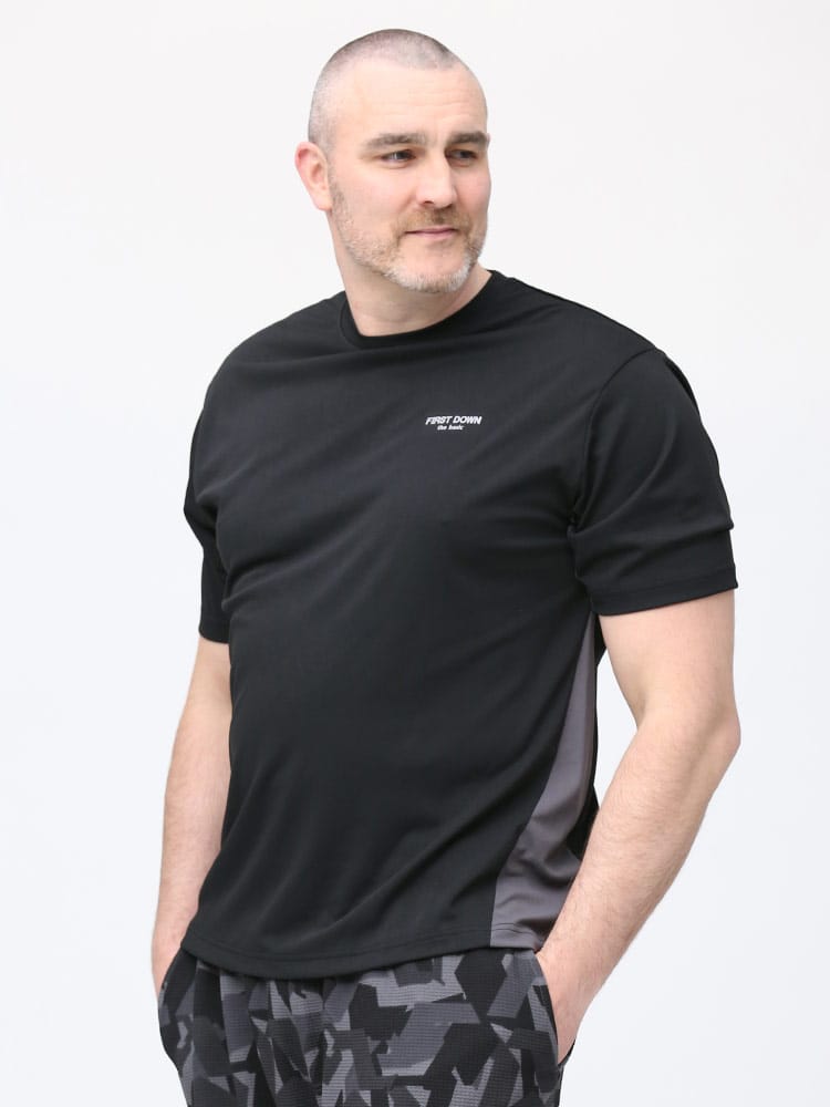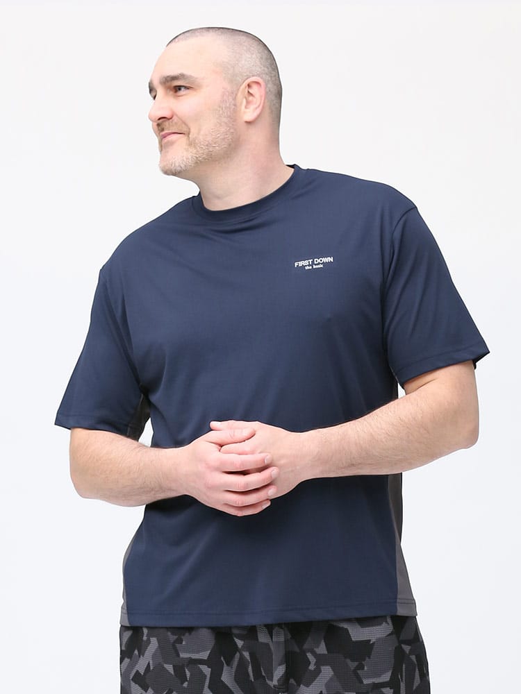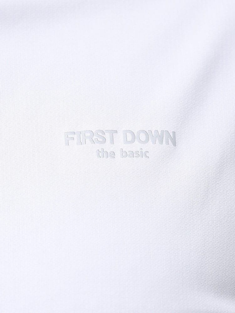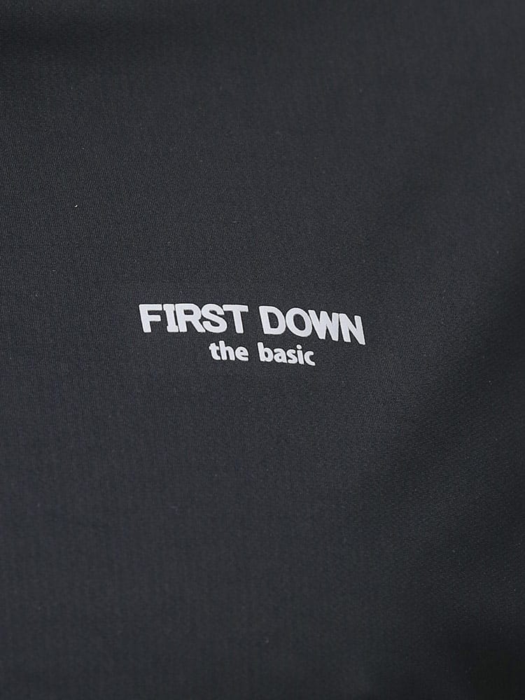 超吸水速乾機能を持ったFIRST DOWN BASICのクルーネック 半袖 Tシャツ。左胸にロゴプリント。脇とサイドは切り替えデザイン。首元はベーシックなクルーネック。。汗を吸い上げ素早く蒸発、サラサラとした快適な着心地。軽量性と紫外線対策でアウトドアやアクティブシーンに最適な一枚です。