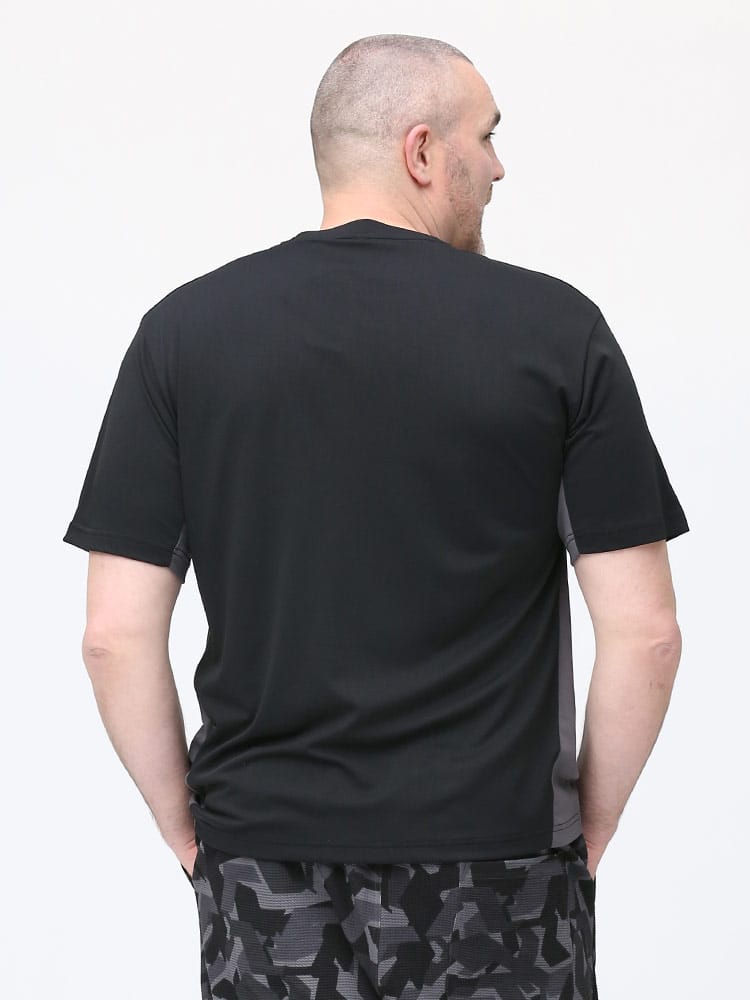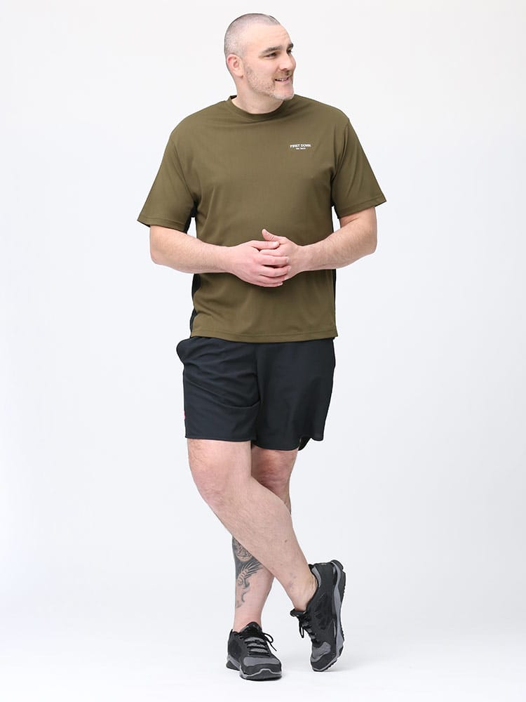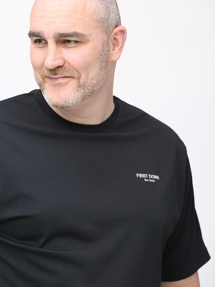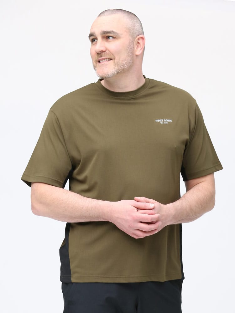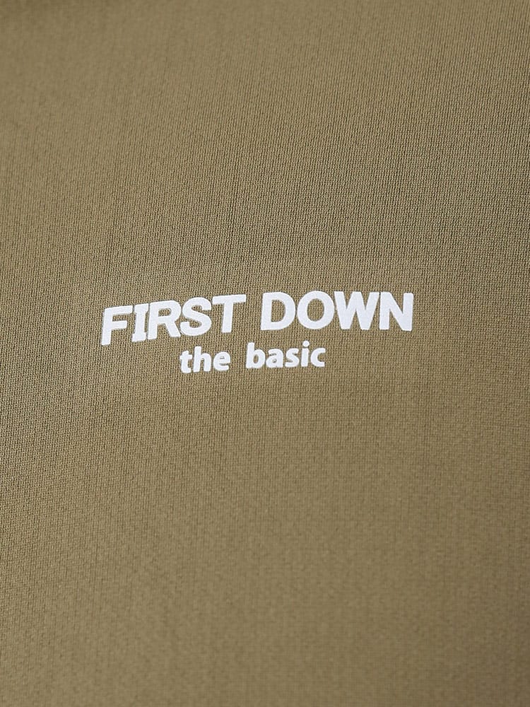 超吸水速乾機能を持ったFIRST DOWN BASICのクルーネック 半袖 Tシャツ。左胸にロゴプリント。脇とサイドは切り替えデザイン。首元はベーシックなクルーネック。。汗を吸い上げ素早く蒸発、サラサラとした快適な着心地。軽量性と紫外線対策でアウトドアやアクティブシーンに最適な一枚です。