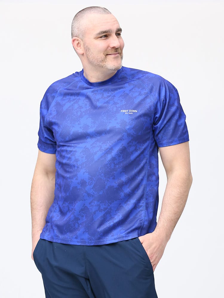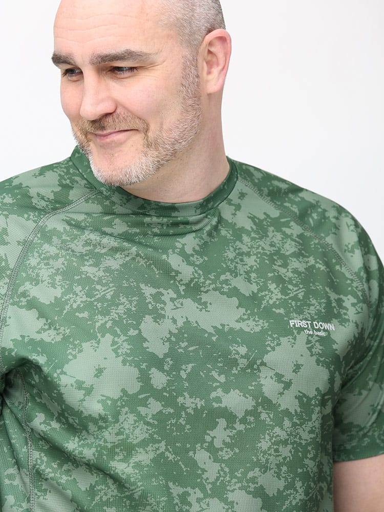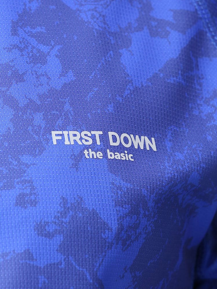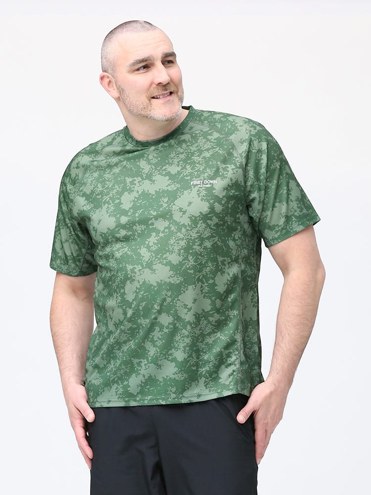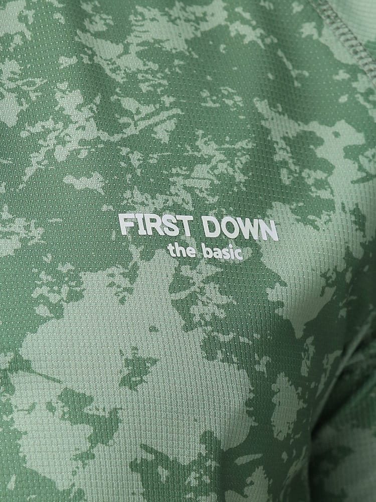 吸水速乾が付いたFIRST DOWN BASICの迷彩プリント クルーネック 半袖 Tシャツ。迷彩プリントに左胸のロゴがポイント。吸水速乾、紫外線対策、通気性、裏側ドライタッチで快適な着心地です。首元はベーシックなクルーネック。アウトドアやアクティブシーンにおすすめの一枚です。