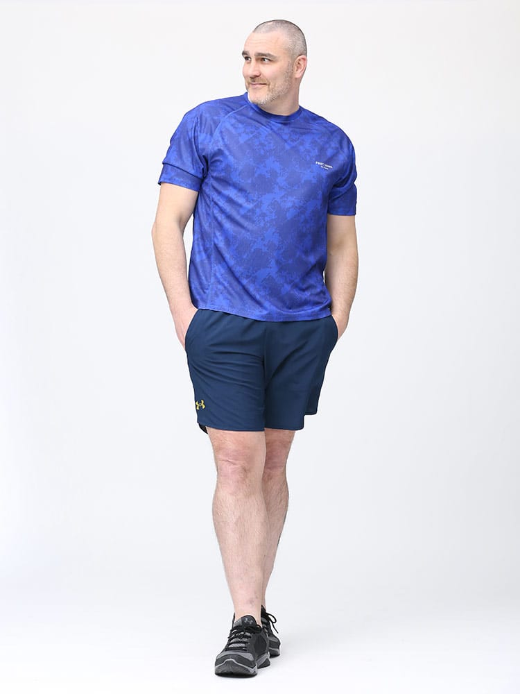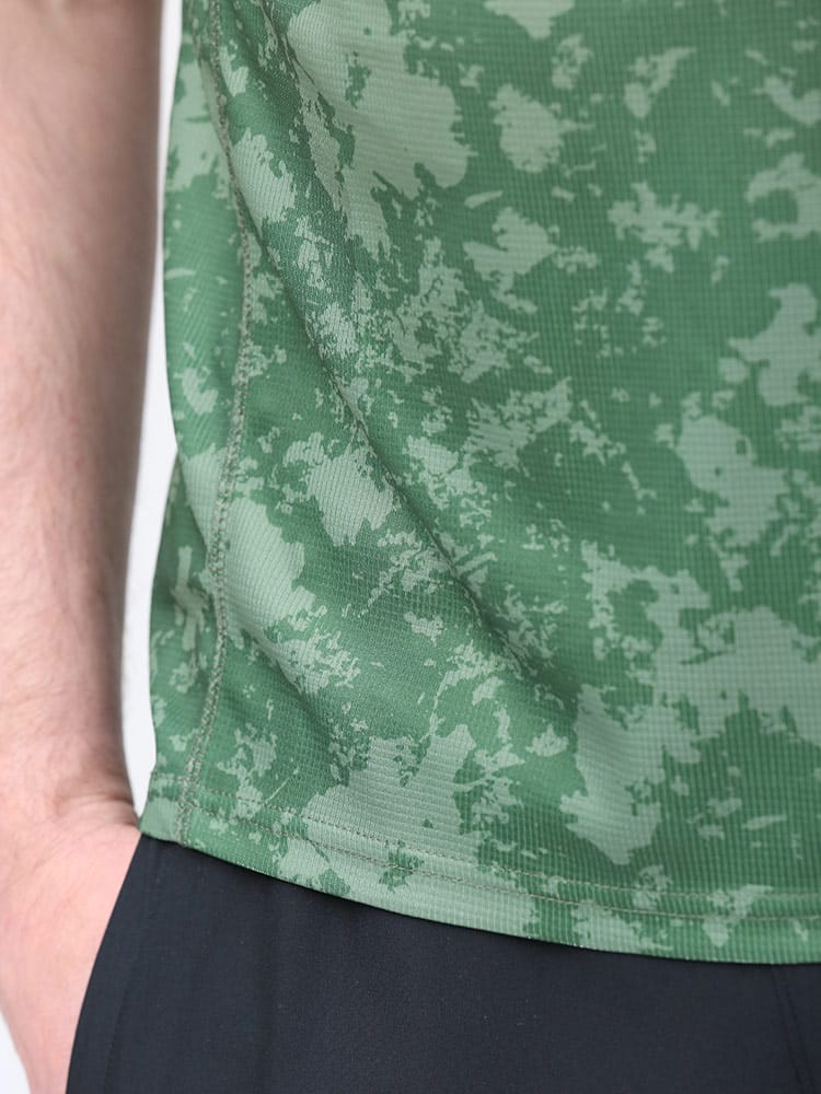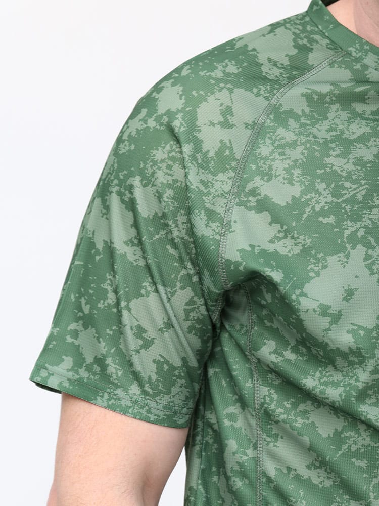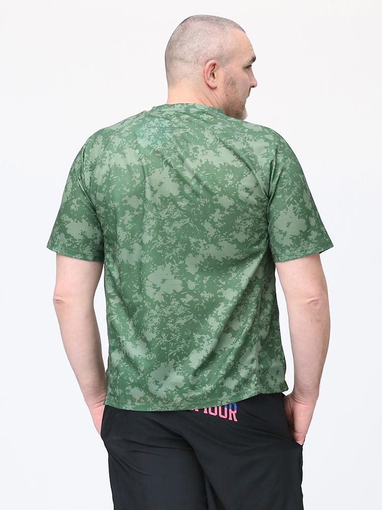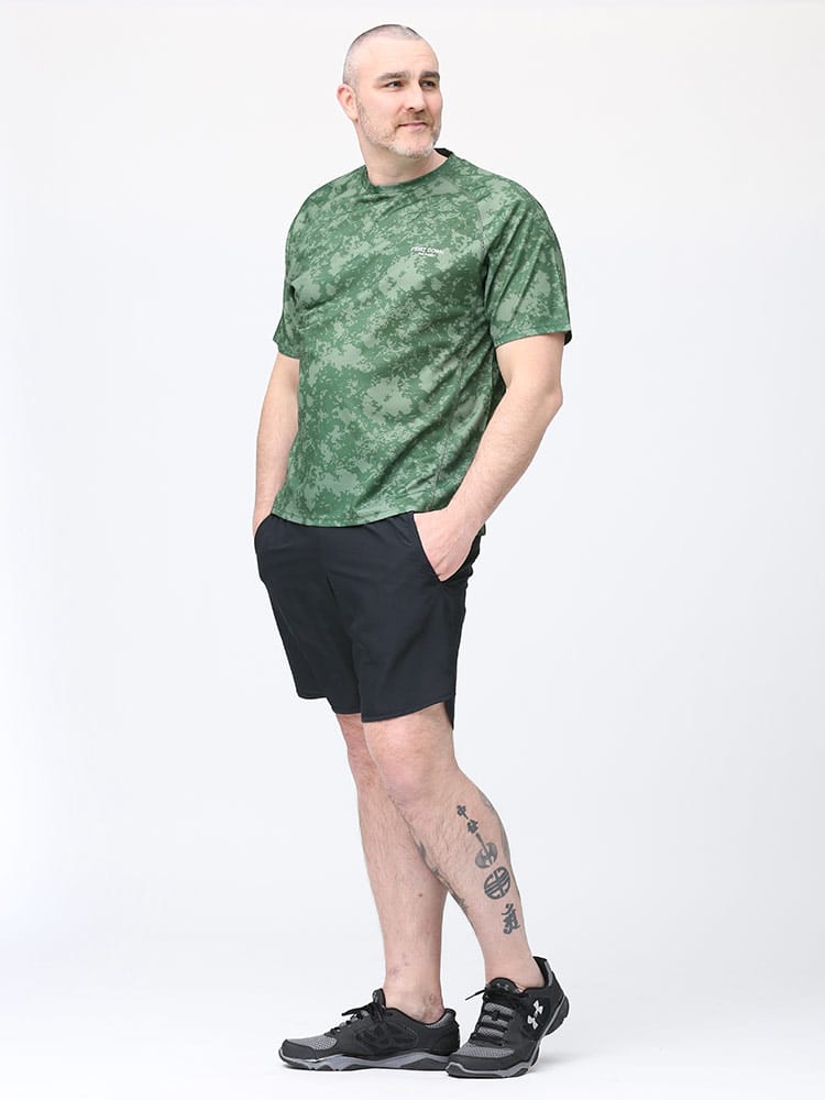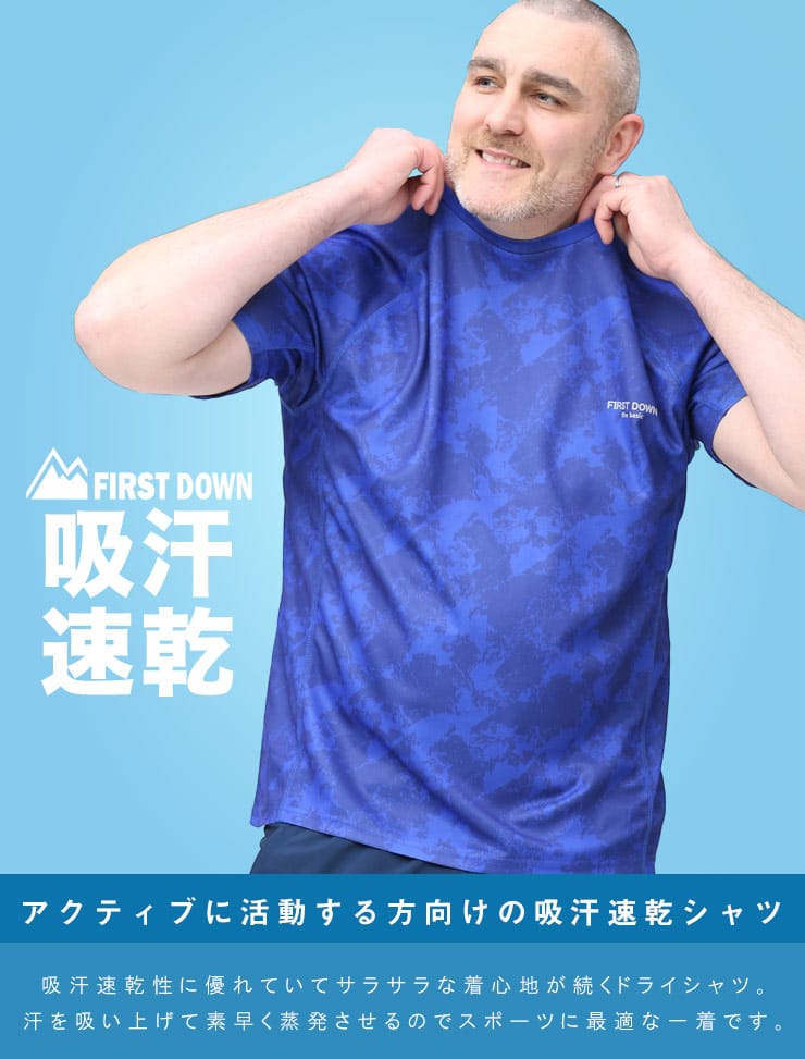 吸水速乾が付いたFIRST DOWN BASICの迷彩プリント クルーネック 半袖 Tシャツ。迷彩プリントに左胸のロゴがポイント。吸水速乾、紫外線対策、通気性、裏側ドライタッチで快適な着心地です。首元はベーシックなクルーネック。アウトドアやアクティブシーンにおすすめの一枚です。