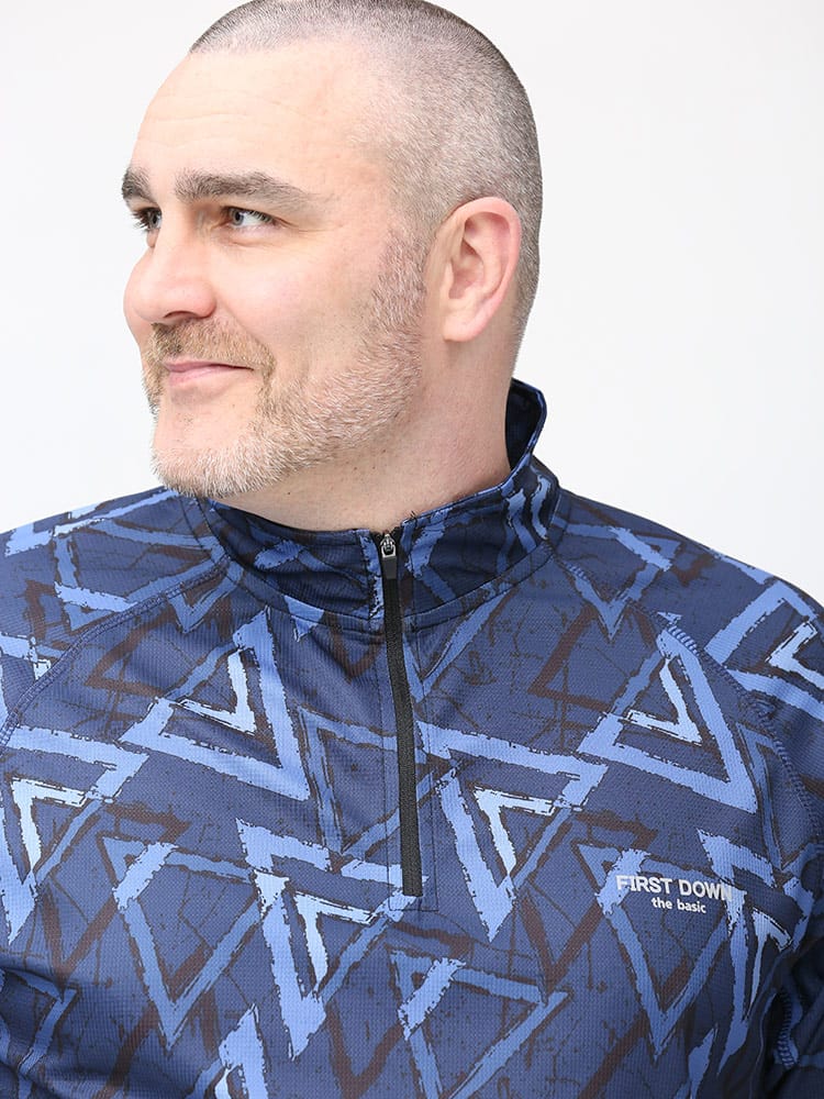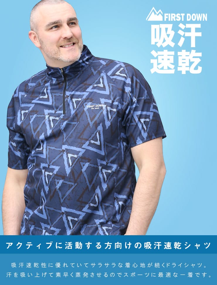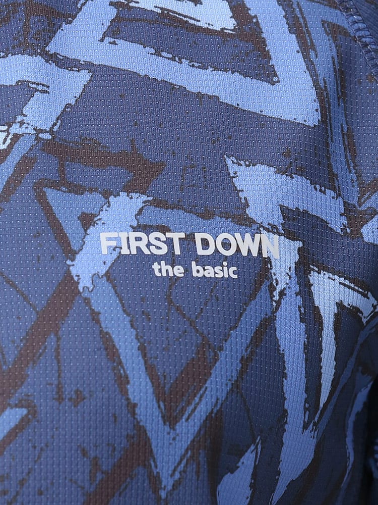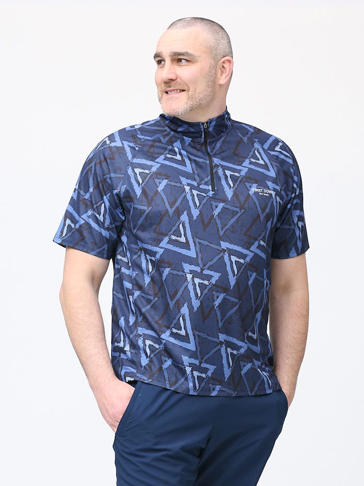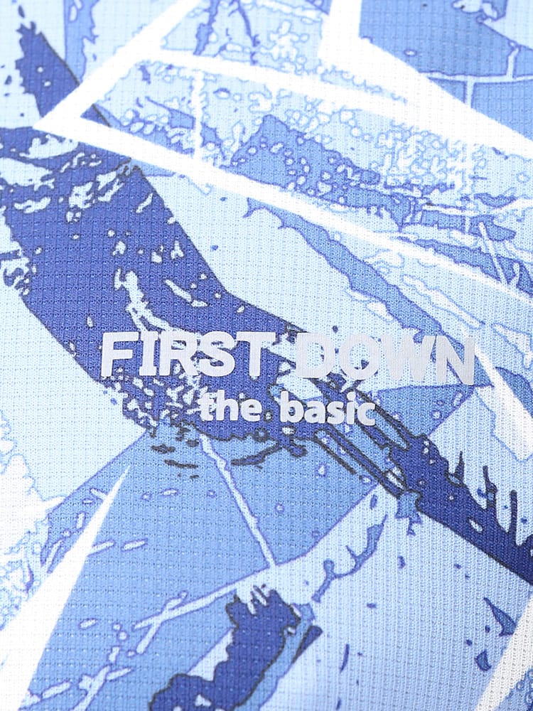 吸水速乾が付いたFIRST DOWN BASICの総柄プリント ハーフジップ 半袖 シャツ。総柄プリントに左胸のロゴがポイント。吸水速乾、紫外線対策、通気性、裏側ドライタッチで快適な着心地です。首元は着脱が楽なハーフジップデザイン。アウトドアやアクティブシーンにおすすめの一枚です。